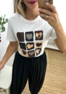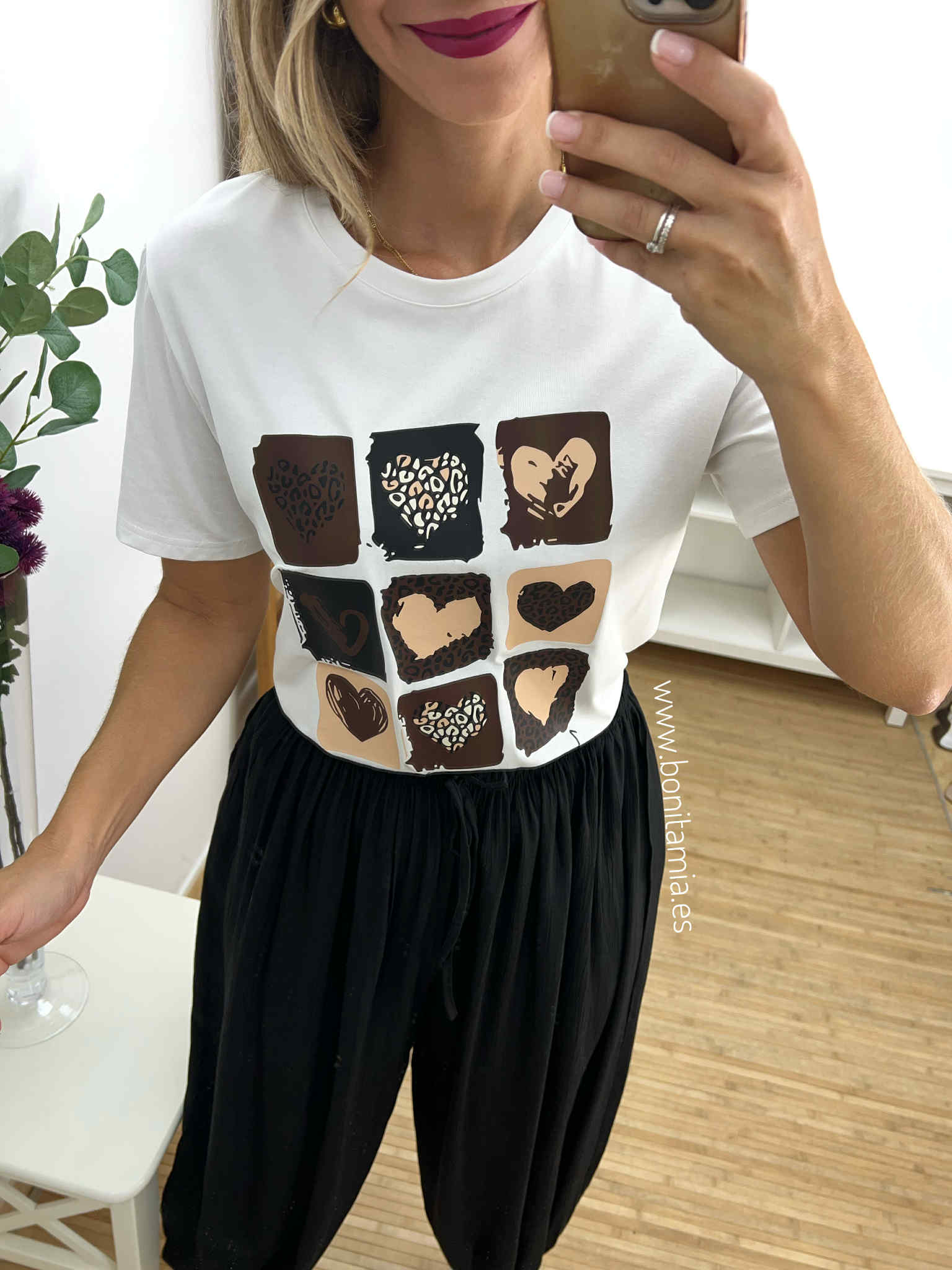 Camiseta blanca con dibujo mosaico corazones, print leopardo, en tonos marrón y negro.