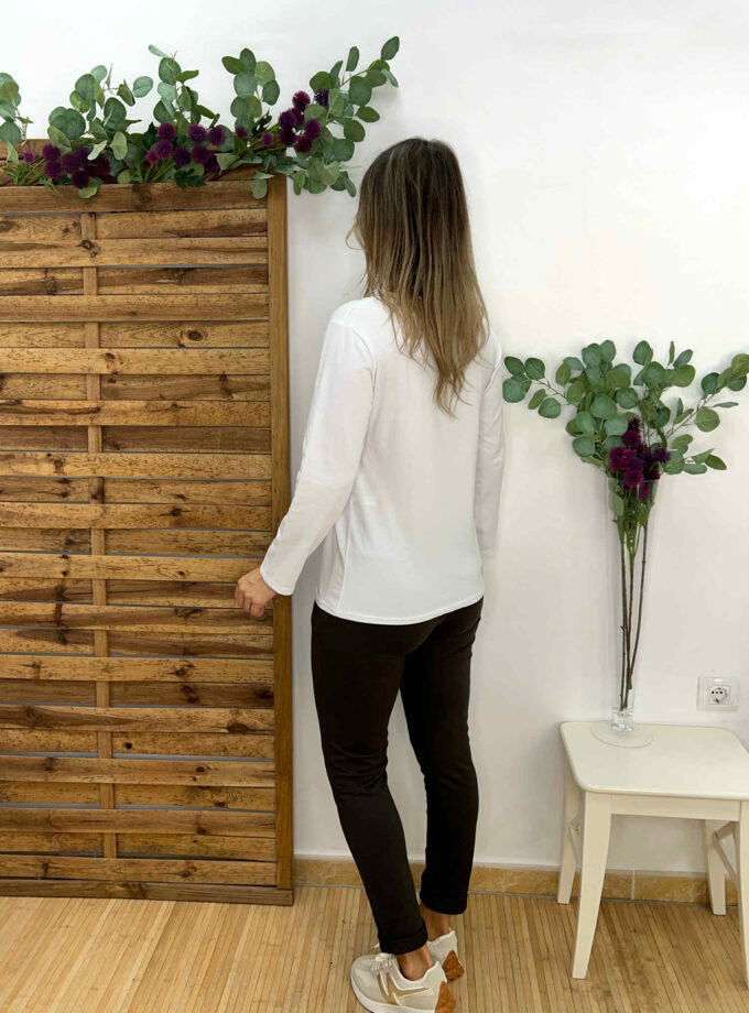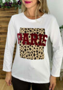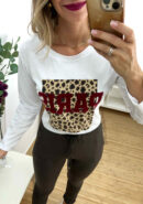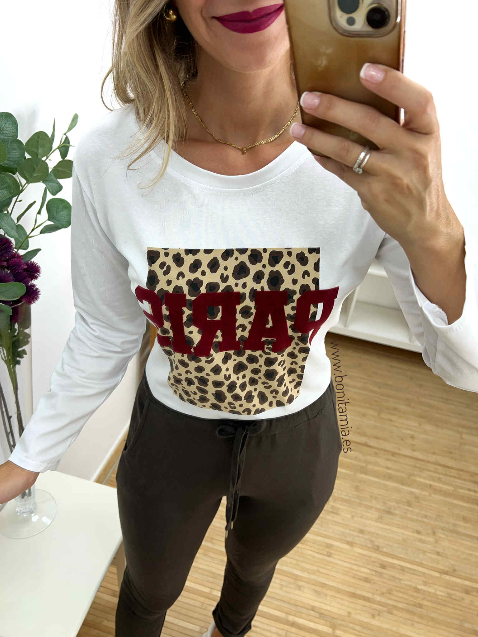 Camiseta blanca de manga larga con estampado en leopardo y letrero en color burdeos en tacto melocotón.
