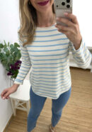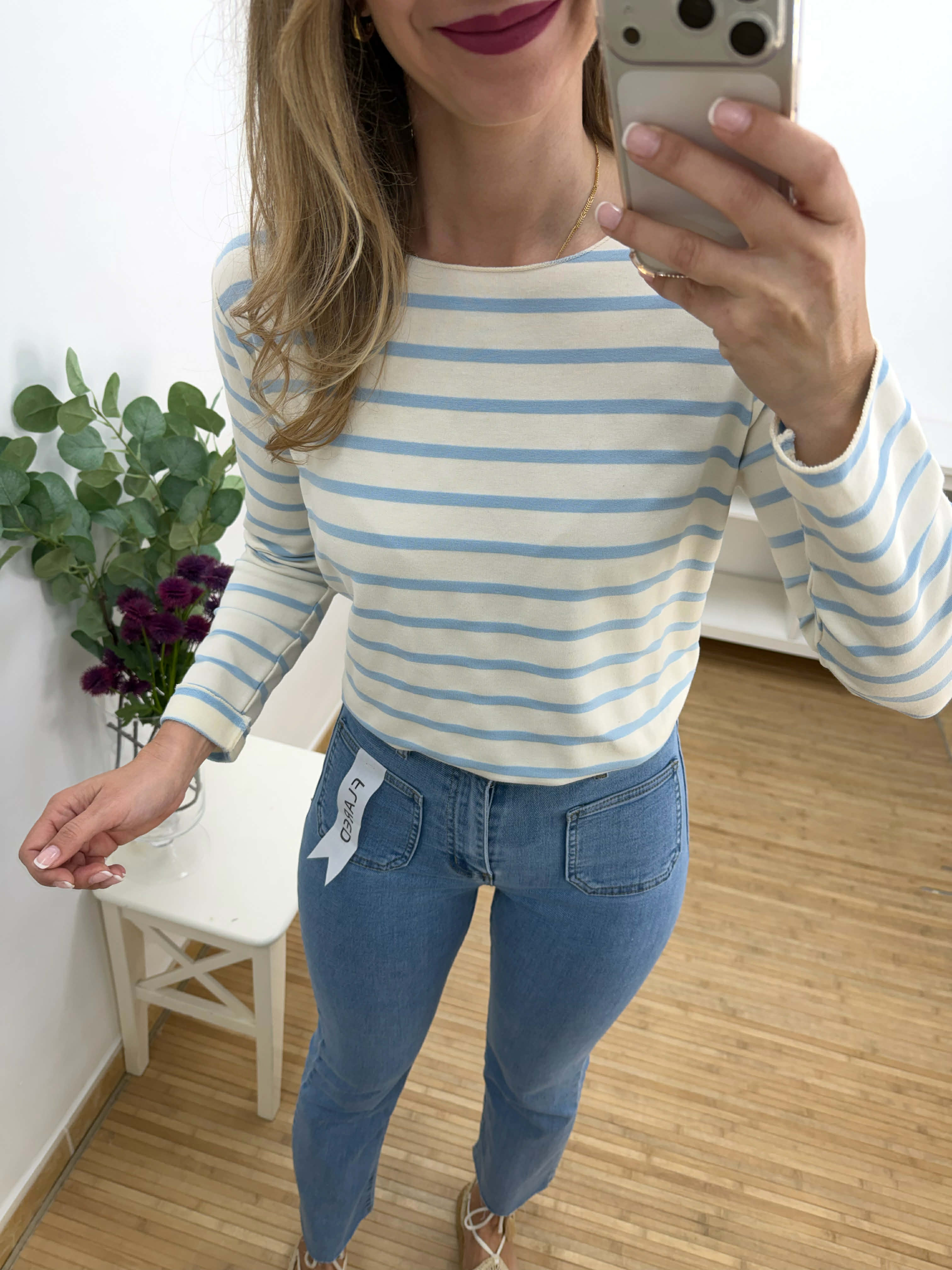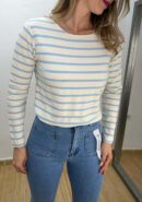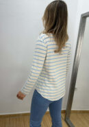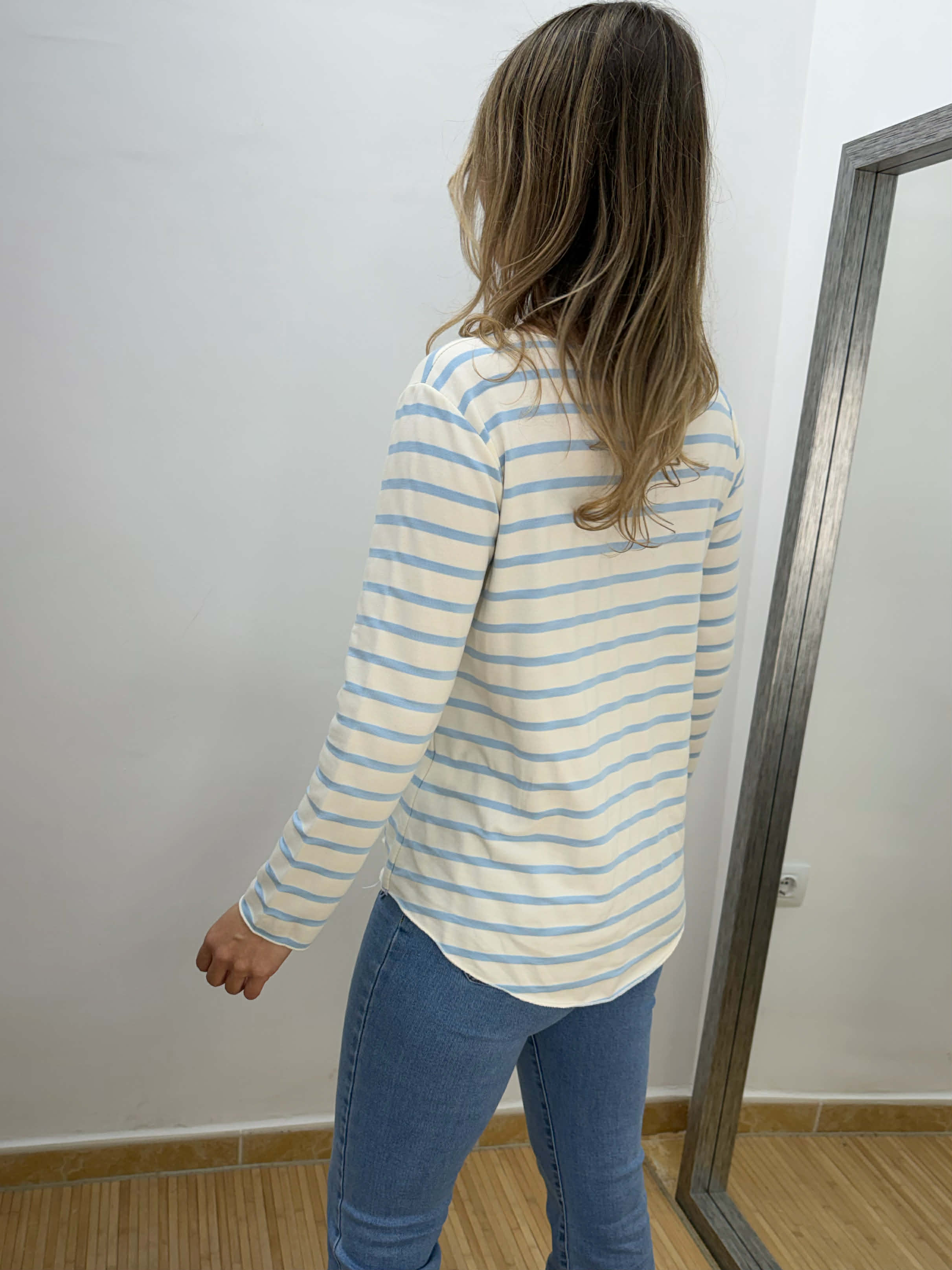 Camiseta de rayas celeste y blanca con parte de atrás más larga.