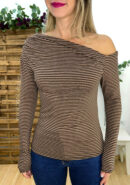 Camiseta de rayas en tono marrón chocolate de manga larga con escote bardot asimétrico.