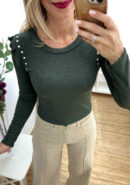 Camiseta de canalé verde militar con volantillos, tachas y detalle de hilo brillo plata.