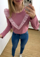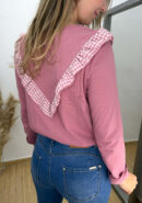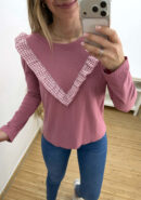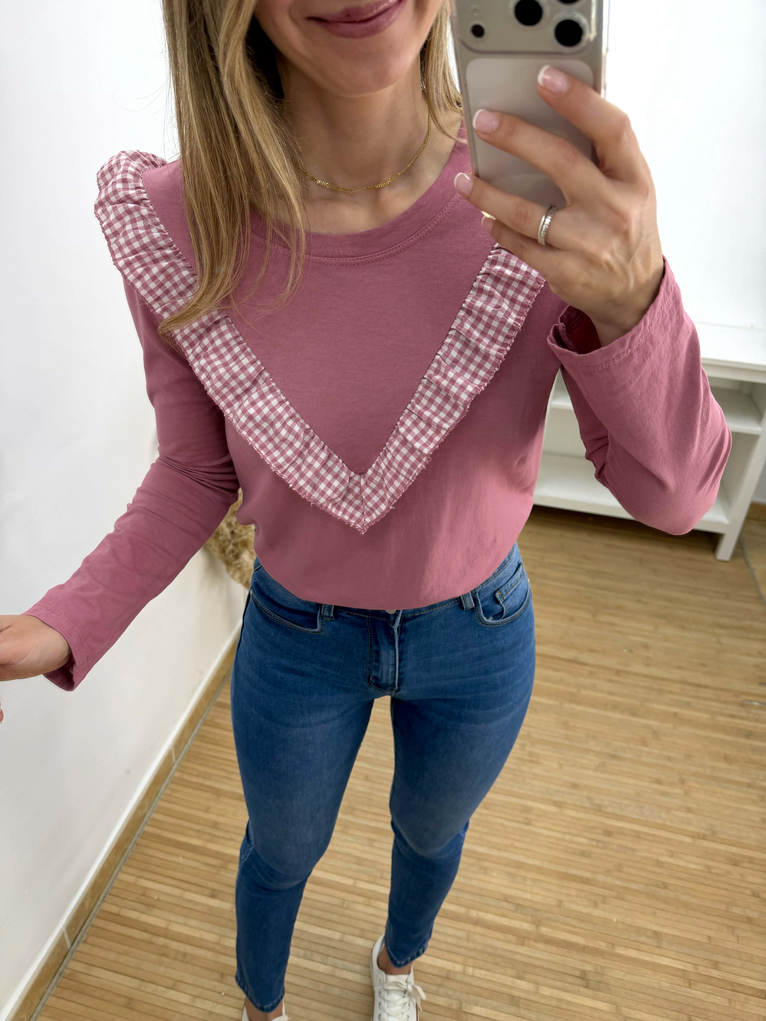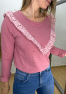 Camiseta rosa de manga larga con volantillo vichy.