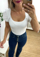 Camiseta de canalé blanca, sisa con volantilo y escote cuadrado.