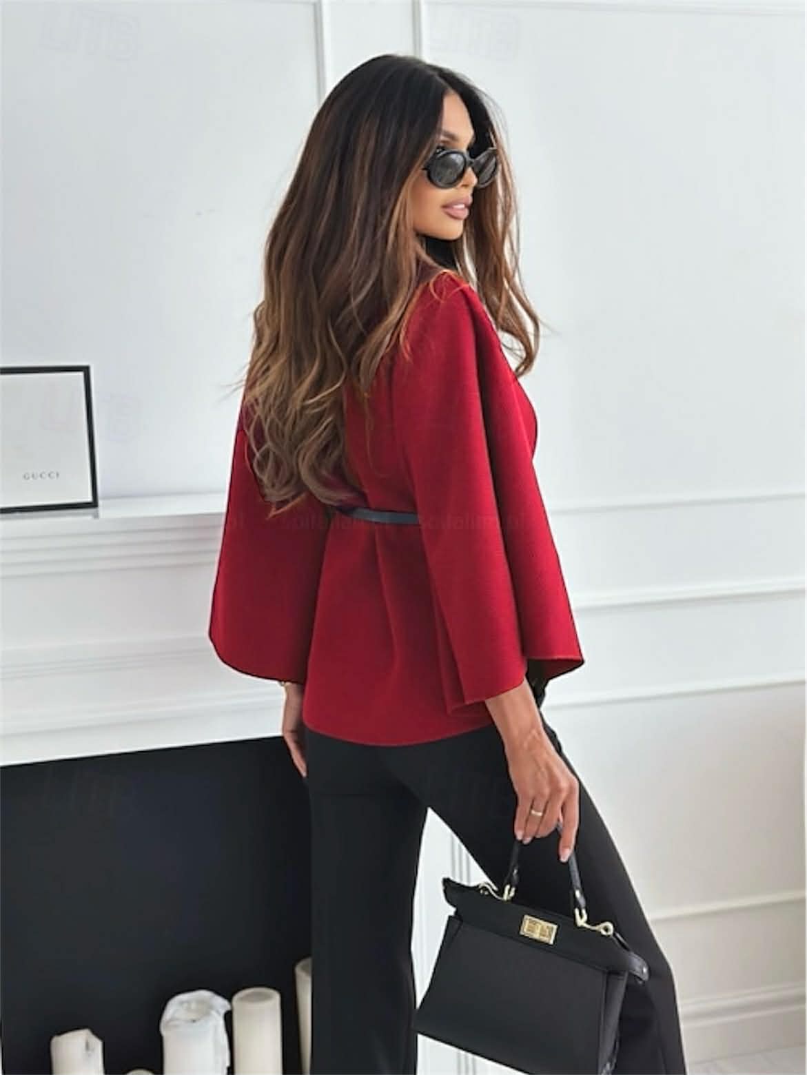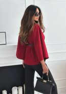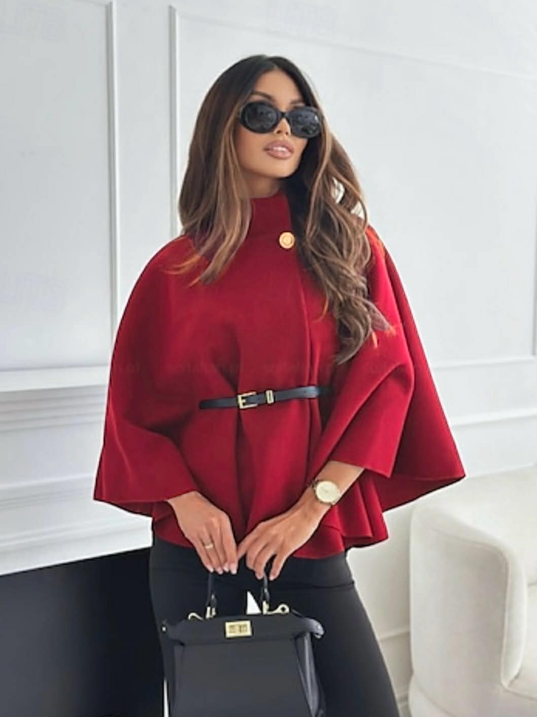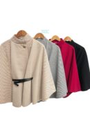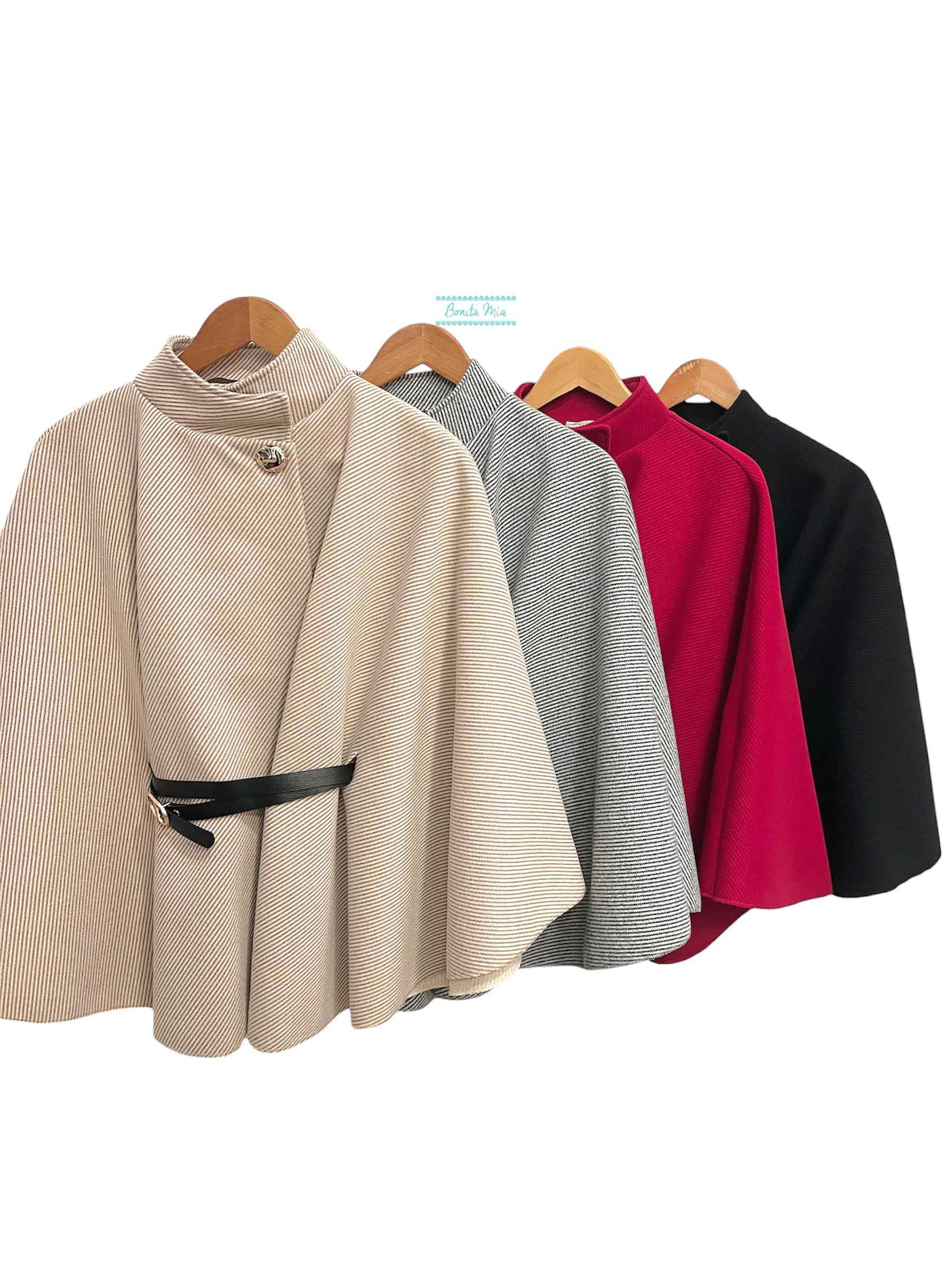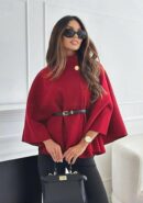 Capa corta de paño con cinturón negro de polipiel y botón en dorado. Colores disponibles: rojo, negro, rayas gris y rayas camel.