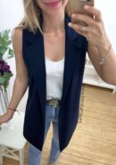 Chaleco largo abierto azul marino con aberturas laterales y forro interior en la zona de la espalda.