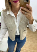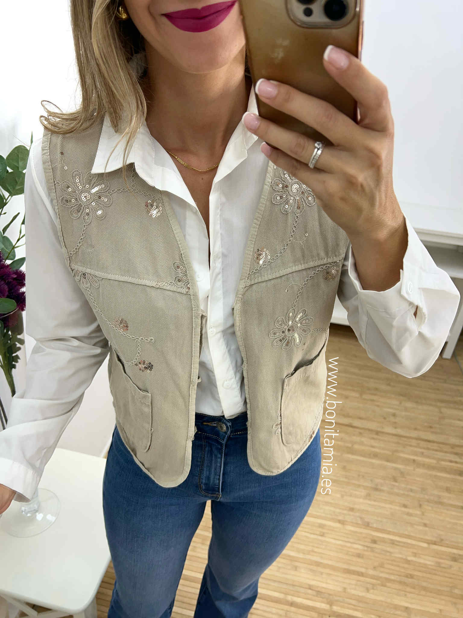 Chaleco beige corto, bordado con lentejuelas en tejido vaquero tintado y dos lazadas para cerrar.