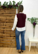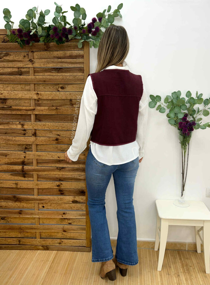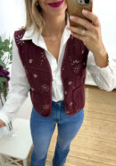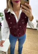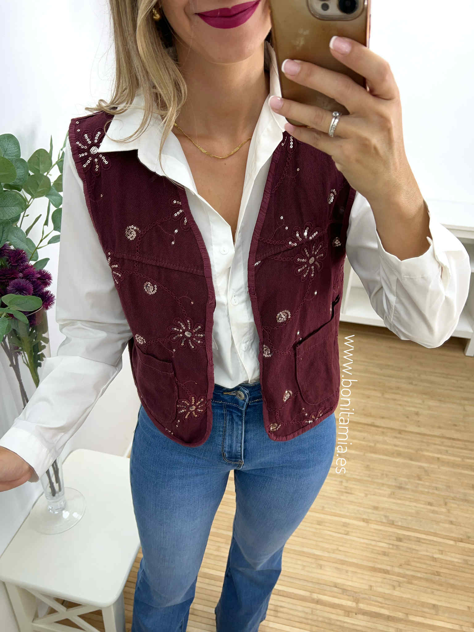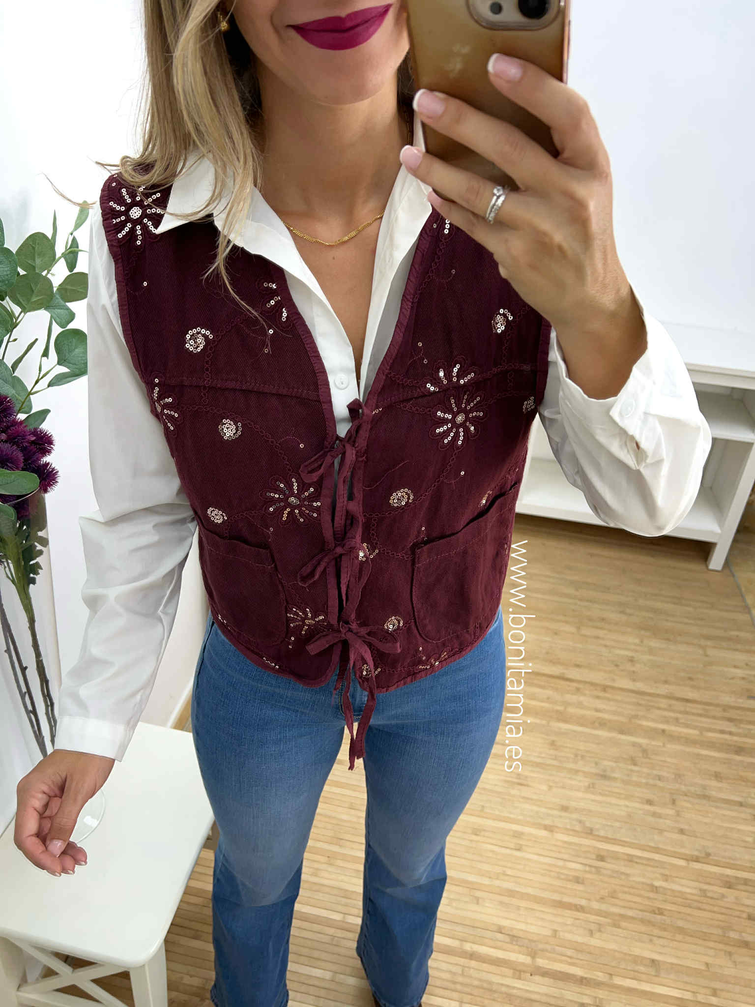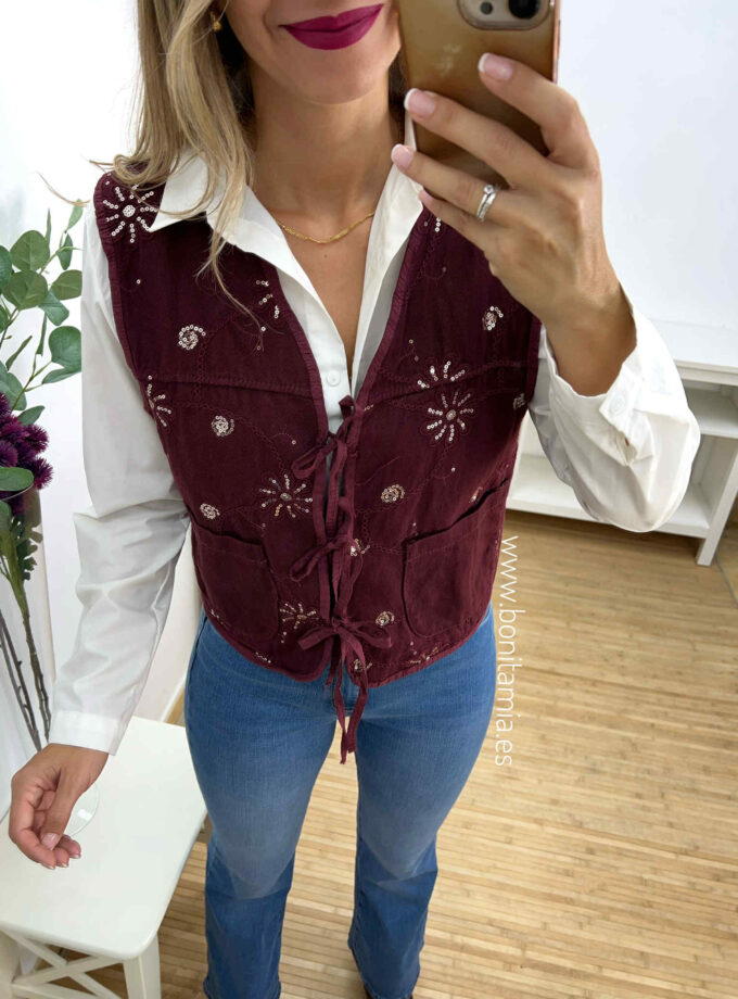 Chaleco burdeos corto, bordado con lentejuelas en tejido vaquero tintado y dos lazadas para cerrar.