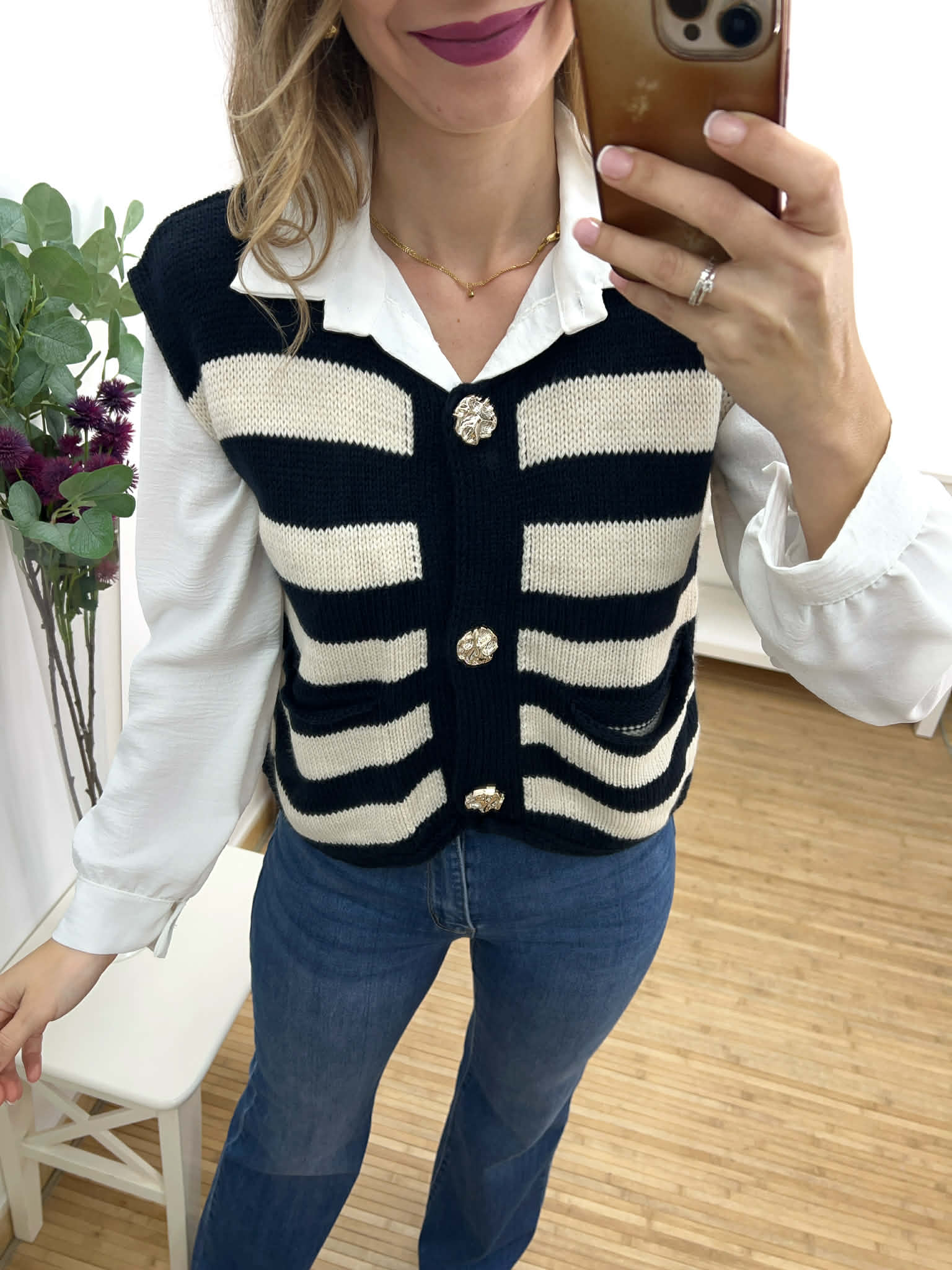 Chaleco corto de punto en color beige con rayas azul marino, cierre de botones en dorado y bolsillos en la parte delantera.