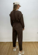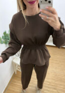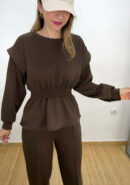 Chándal marrón chocolate. Sudadera con nido de abeja en la cintura efecto peplum. Pantalón balloon con lazada ajustable y bolsillos.