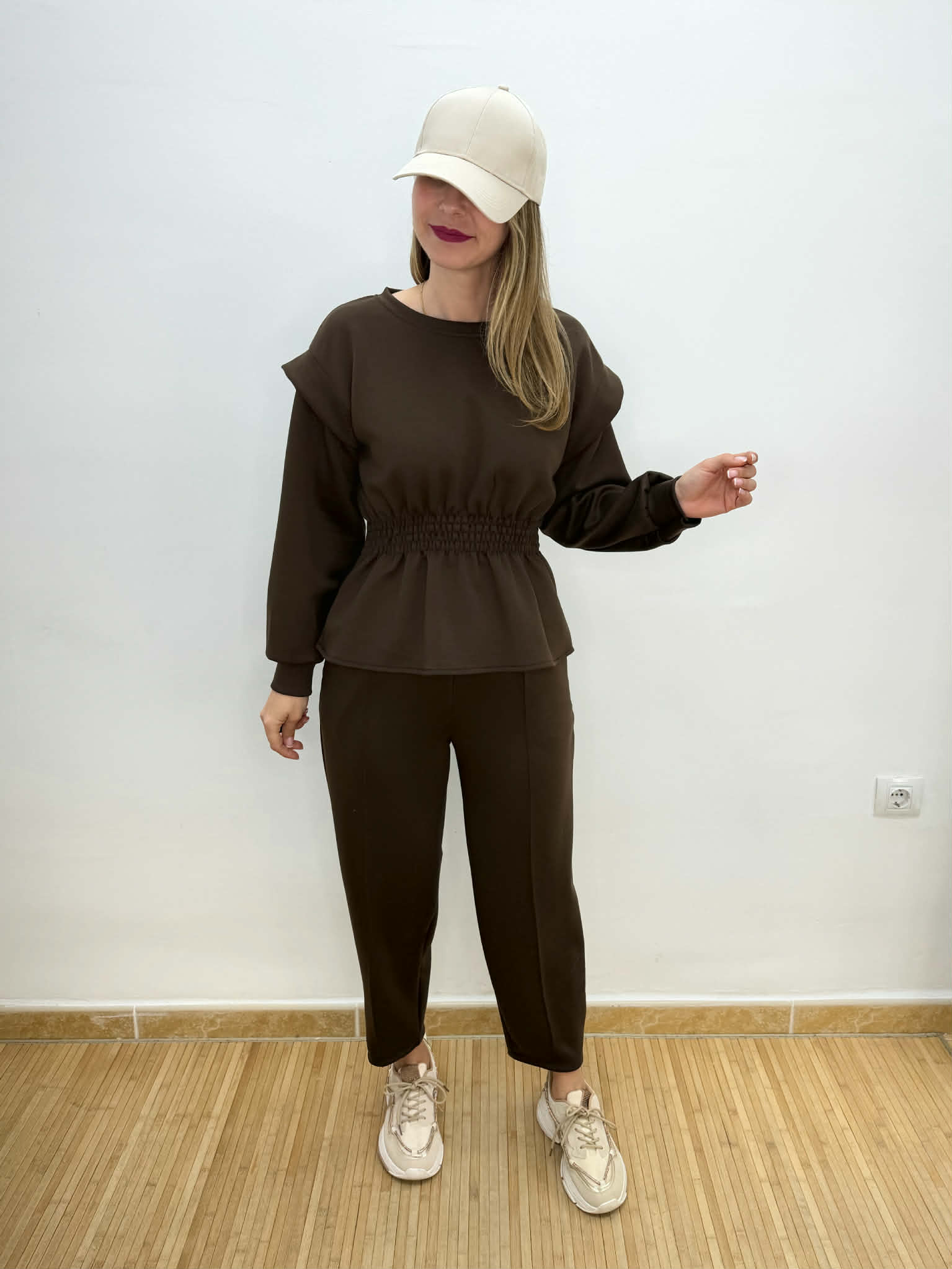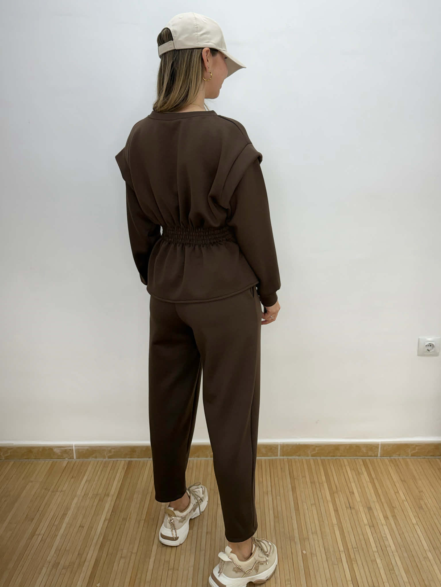 Chándal marrón chocolate. Sudadera con nido de abeja en la cintura efecto peplum. Pantalón balloon con lazada ajustable y bolsillos.