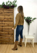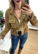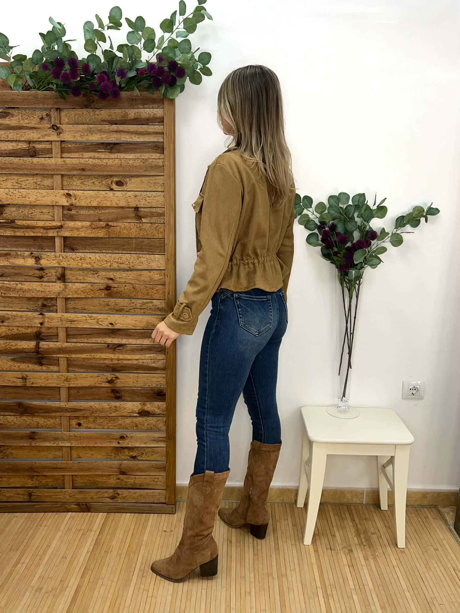 Chaqueta de antelina camel corta con bolsillos delanteros, lazada para ajustar y botones en dorado.