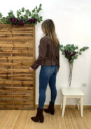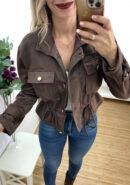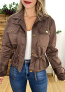 Chaqueta de antelina marrón chocolate corta con bolsillos delanteros, lazada para ajustar y botones en dorado.