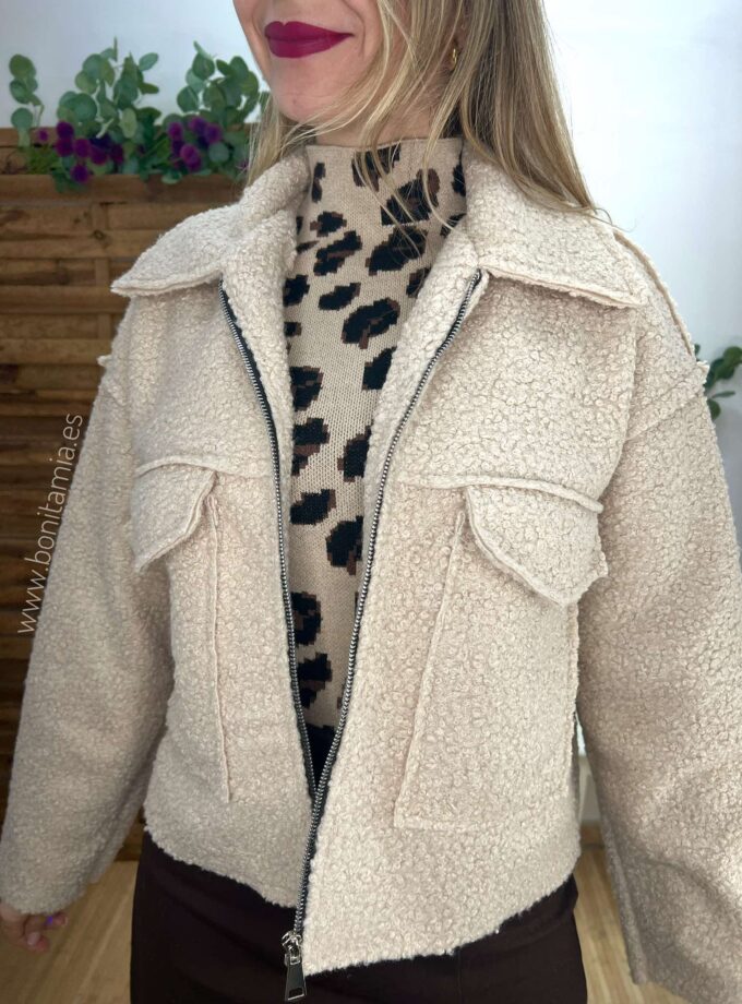 Chaqueta de borrego beige oversize con cremallera y bolsillos delanteros.