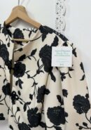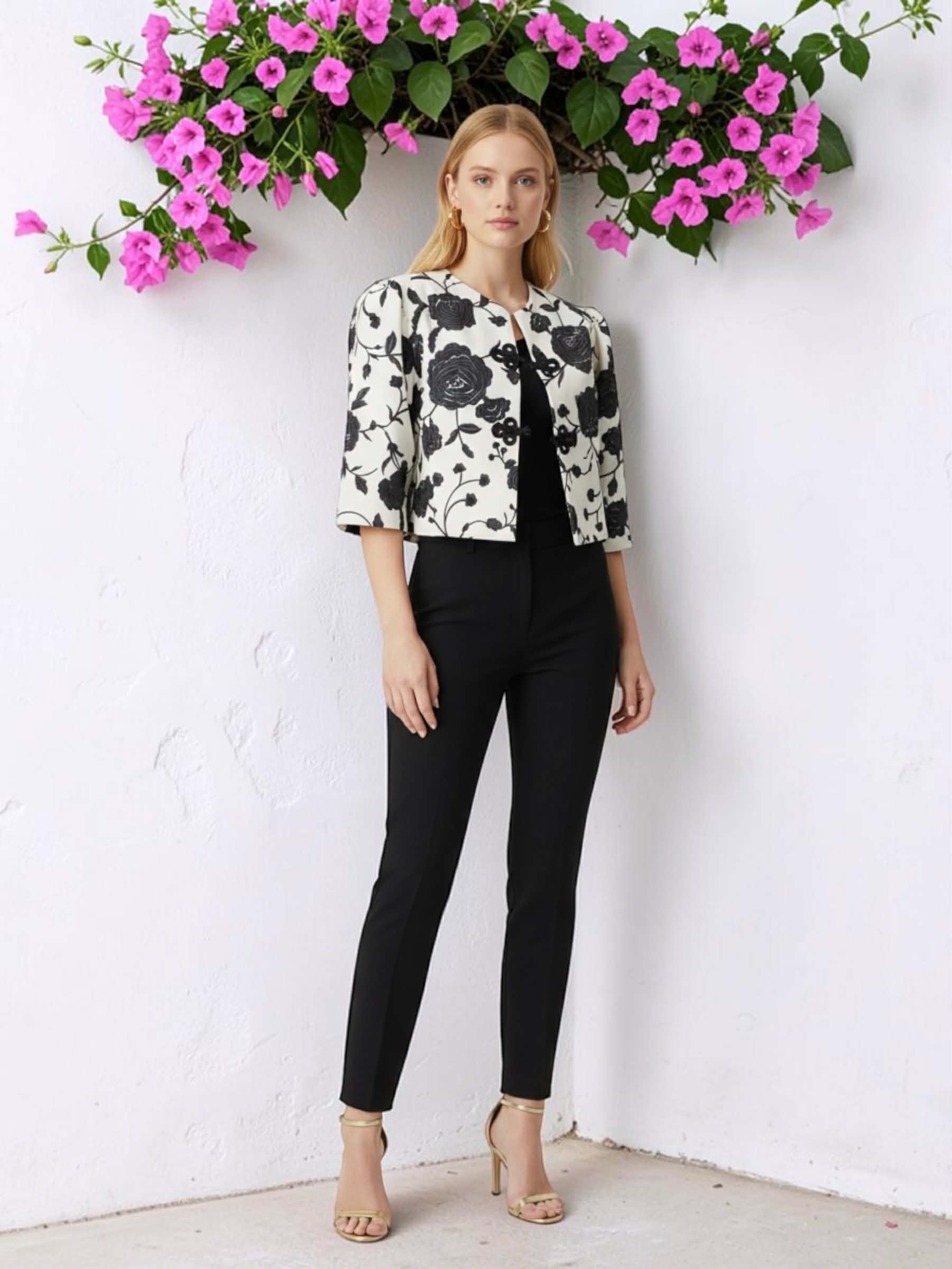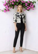 Chaqueta estilo torera blanca con estampado floral negro (efecto bordado) y cierre de aplique bordado.