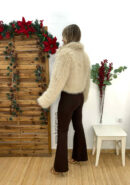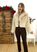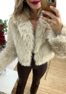 Chaqueta de pelo beige corta con solapas y corchetes para abrochar.