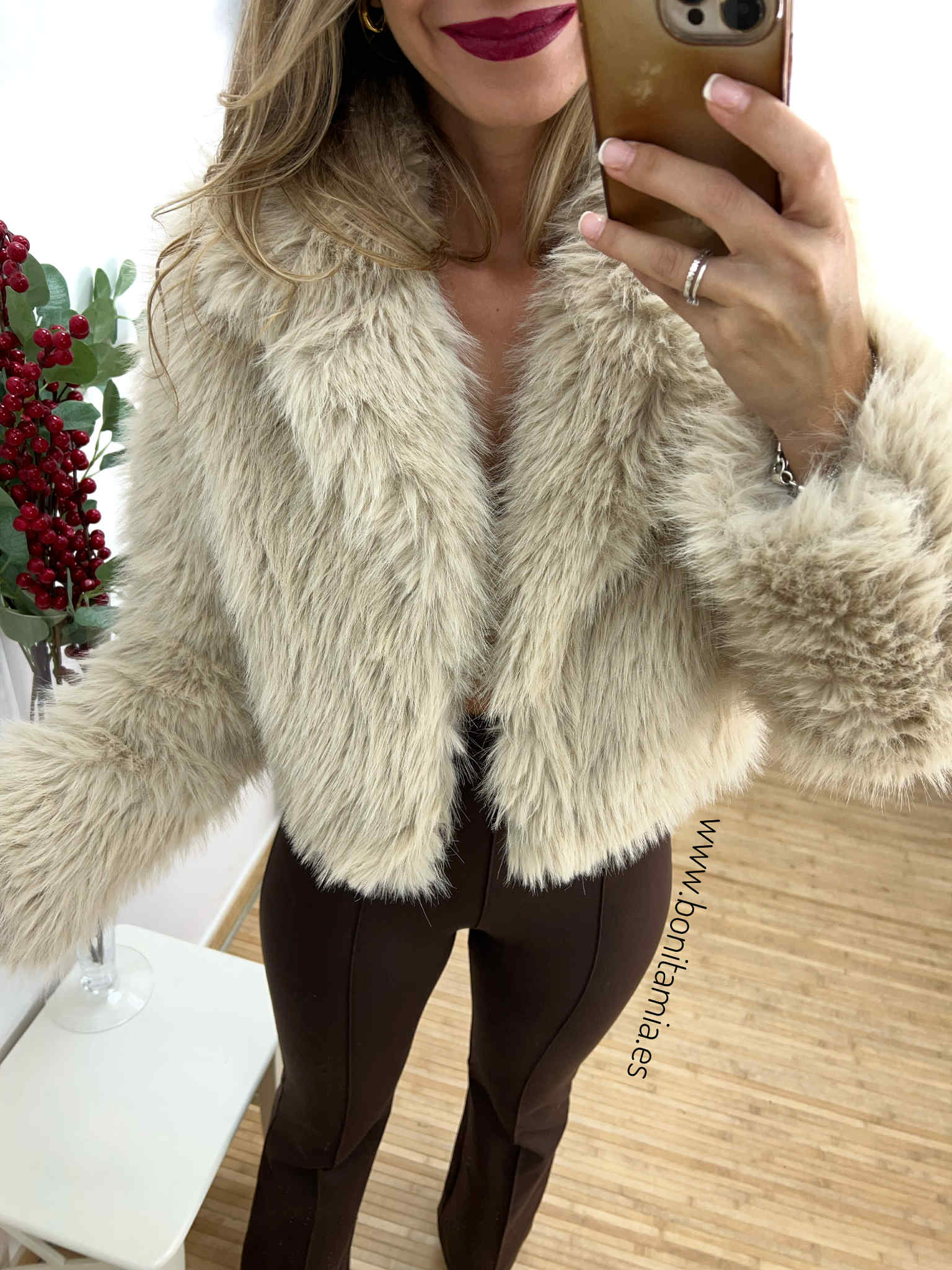 Chaqueta de pelo beige corta con solapas y corchetes para abrochar.