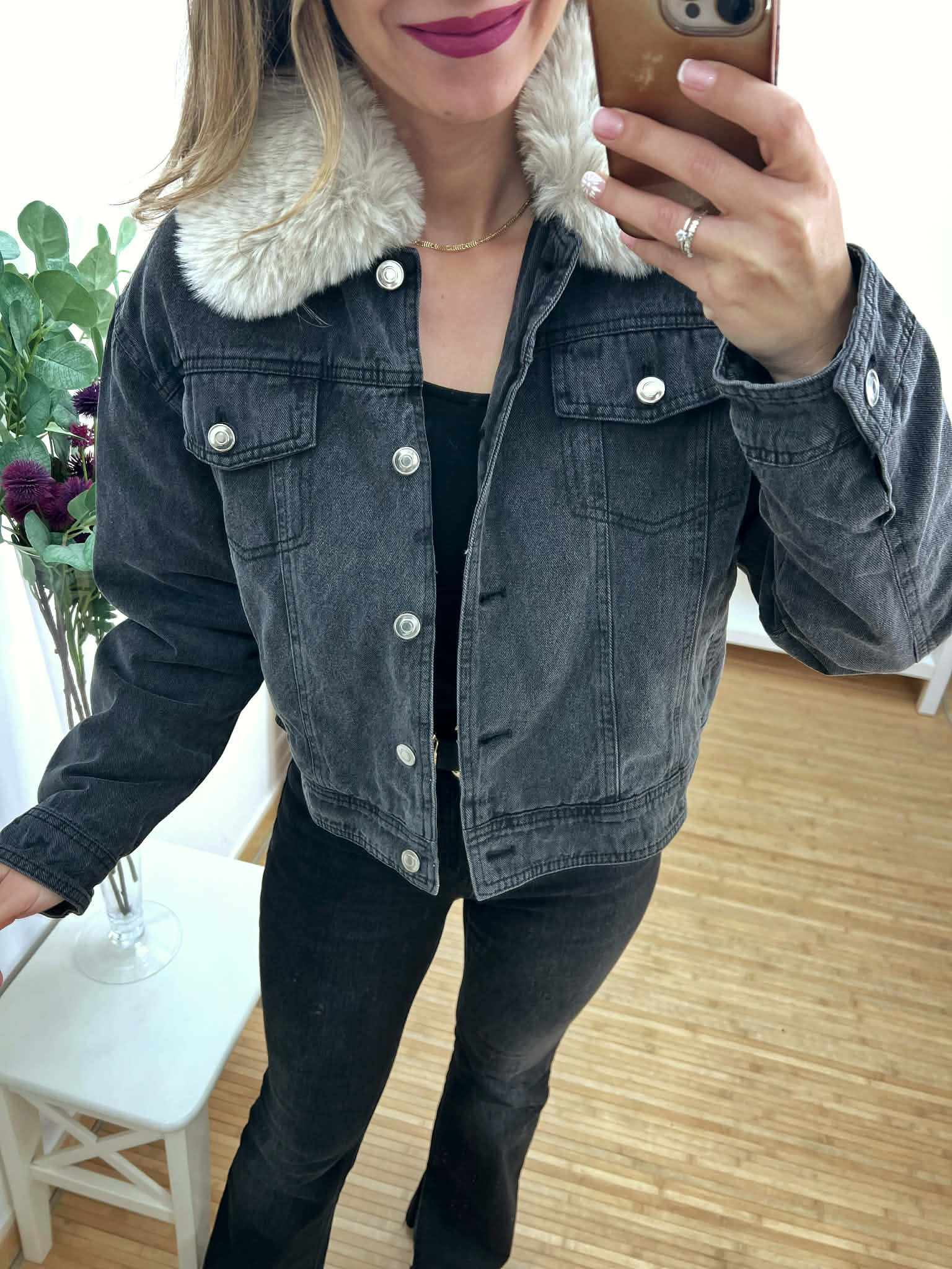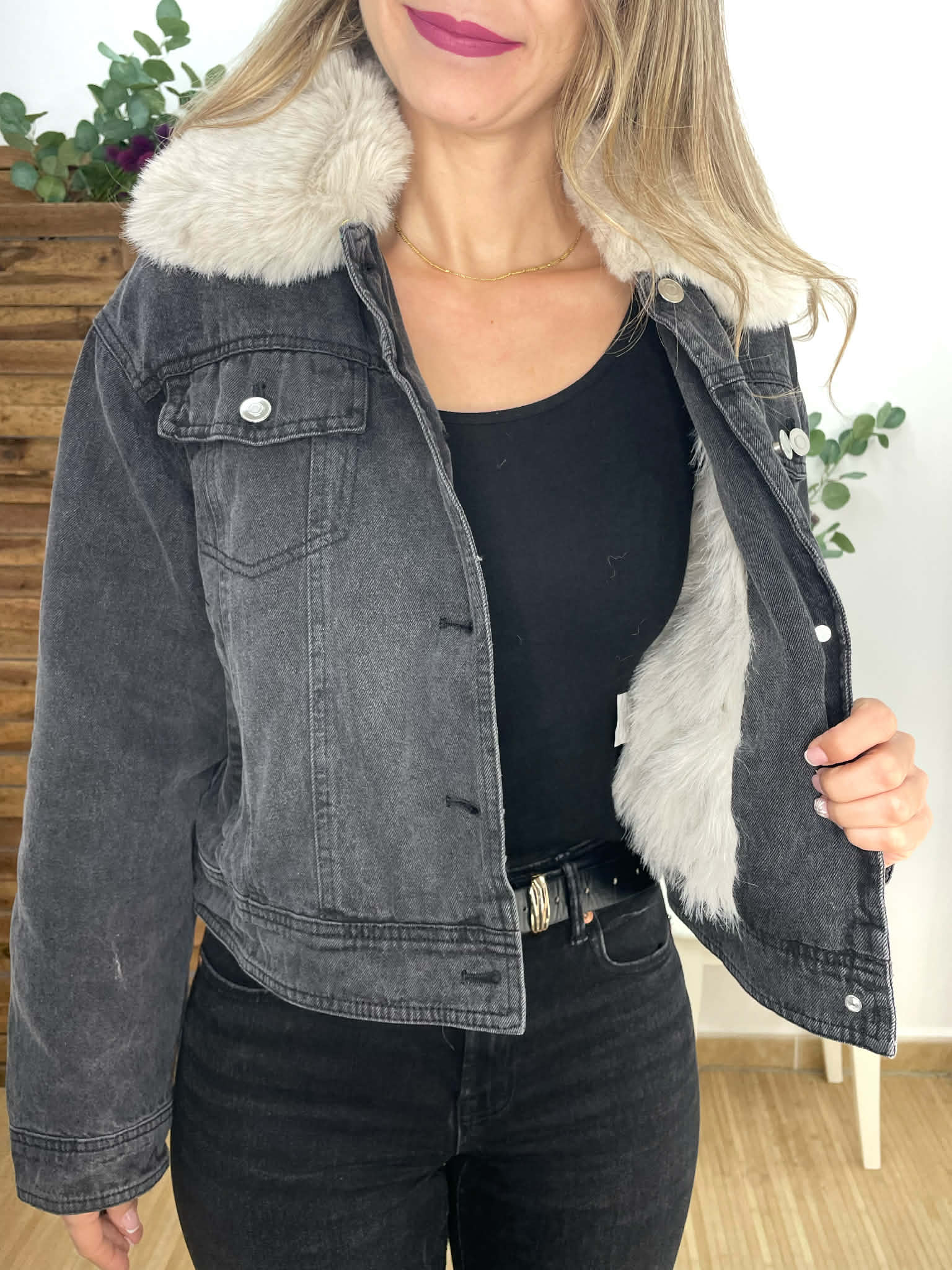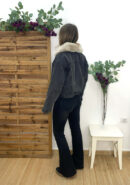 Chaqueta vaquera negra con pelito interior y bolsillos delanteros. Cuello desmontable.