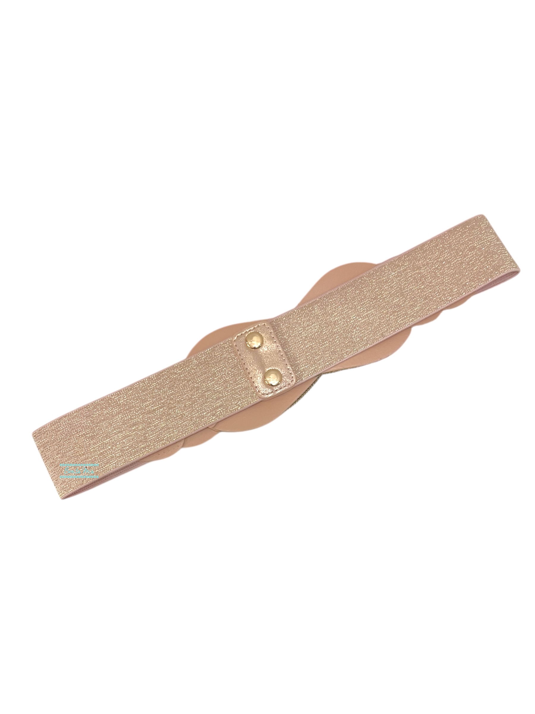 Cinturón elástico con nudo marinero en mini cristales de color oro rosa. Cierre botón click.