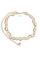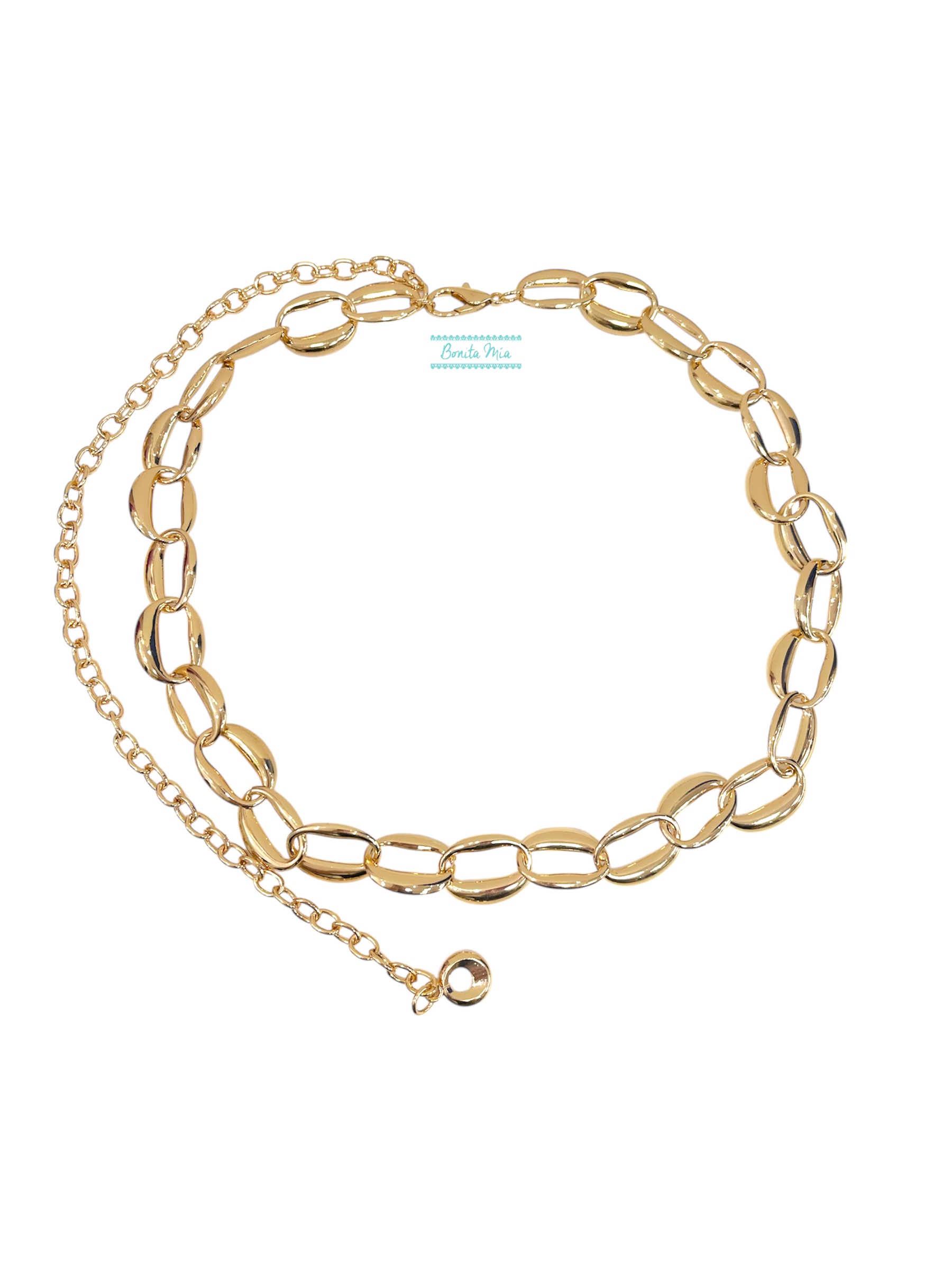Cinturón metal dorados de óvalos irregulares en cadena. Tipo de cierre: cadena con mosquetón.