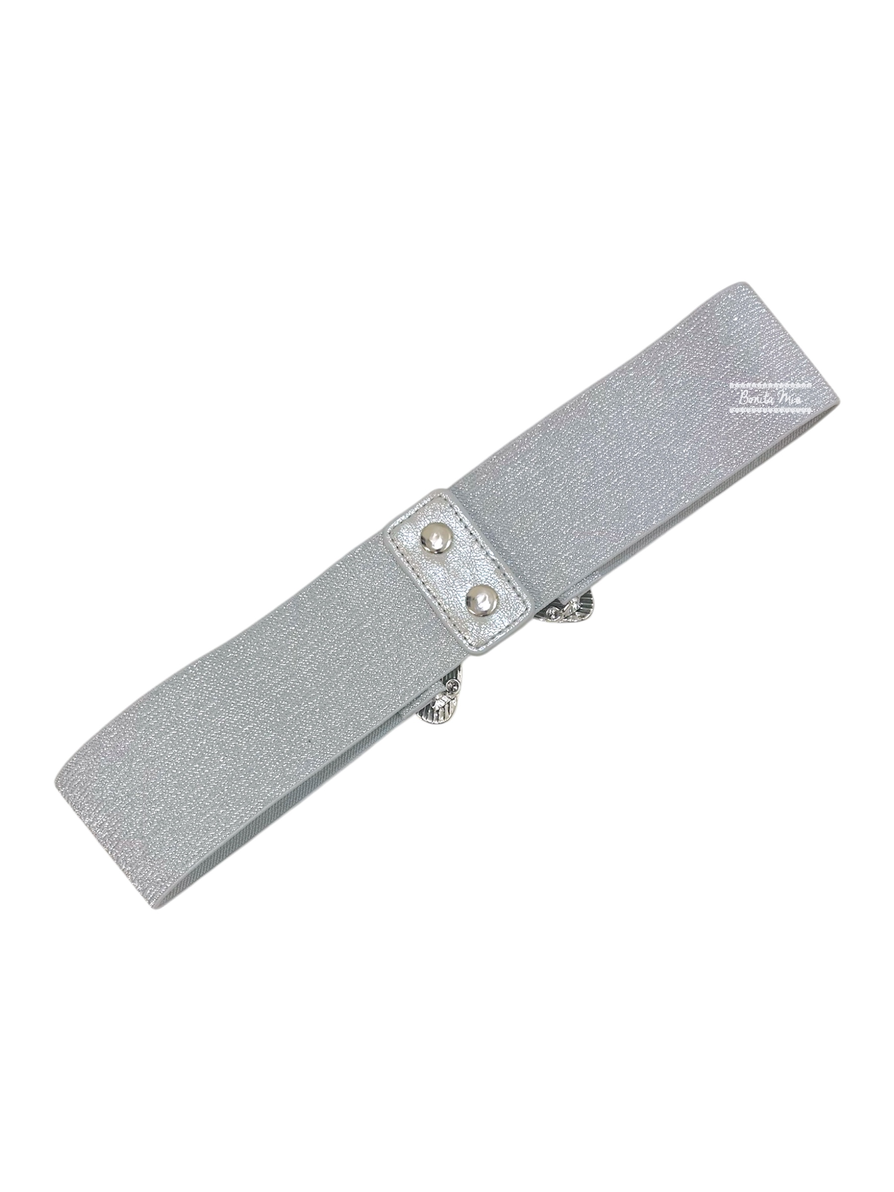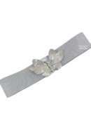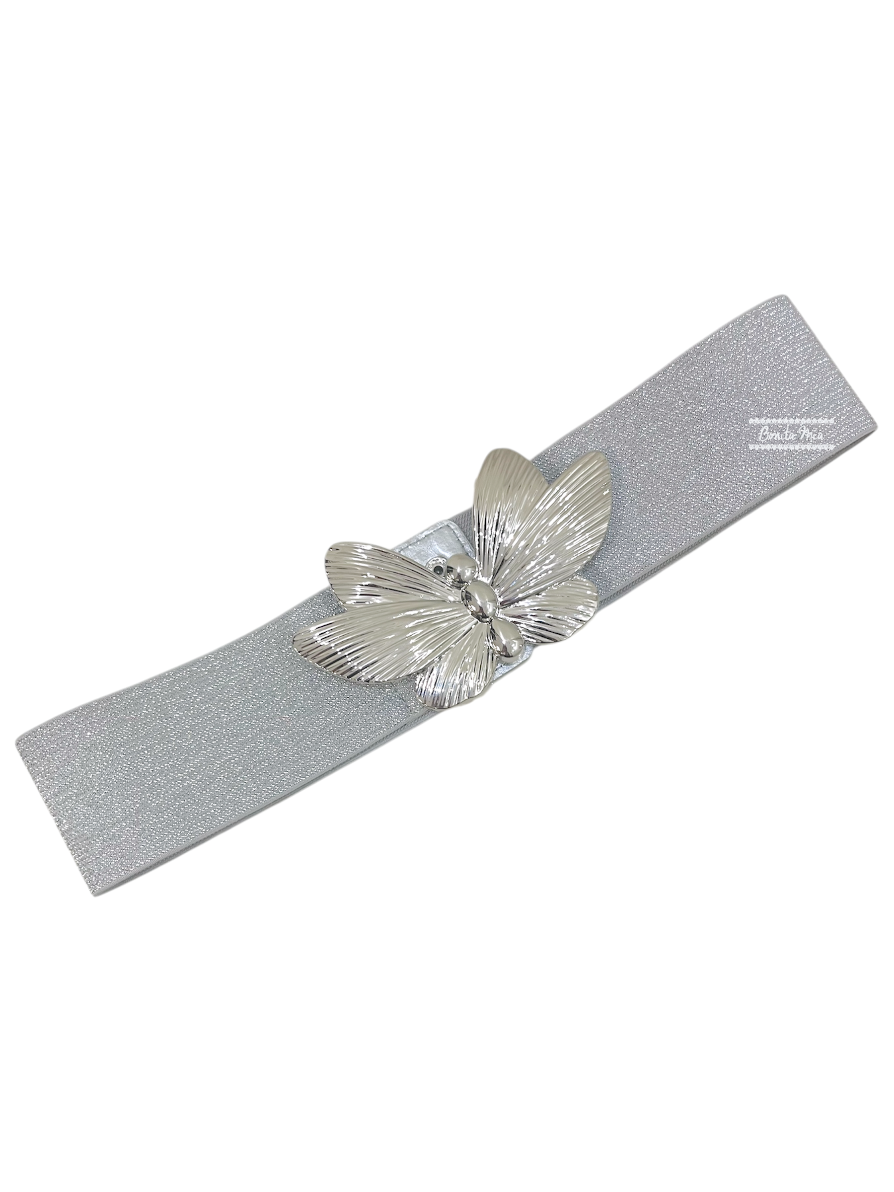 Cinturón elástico plata con detalle de mariposa de metal. Cierre botón click.