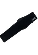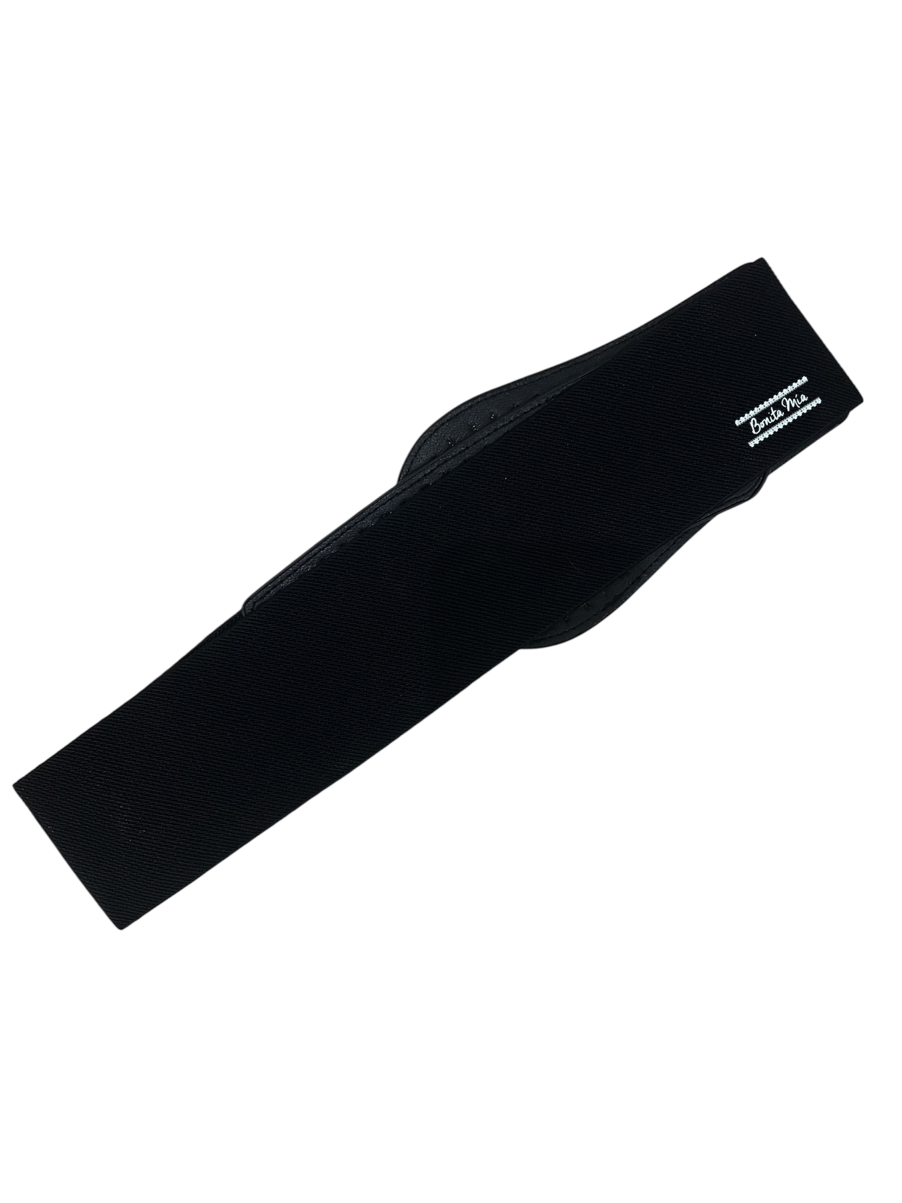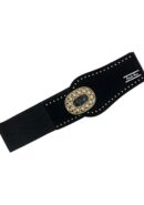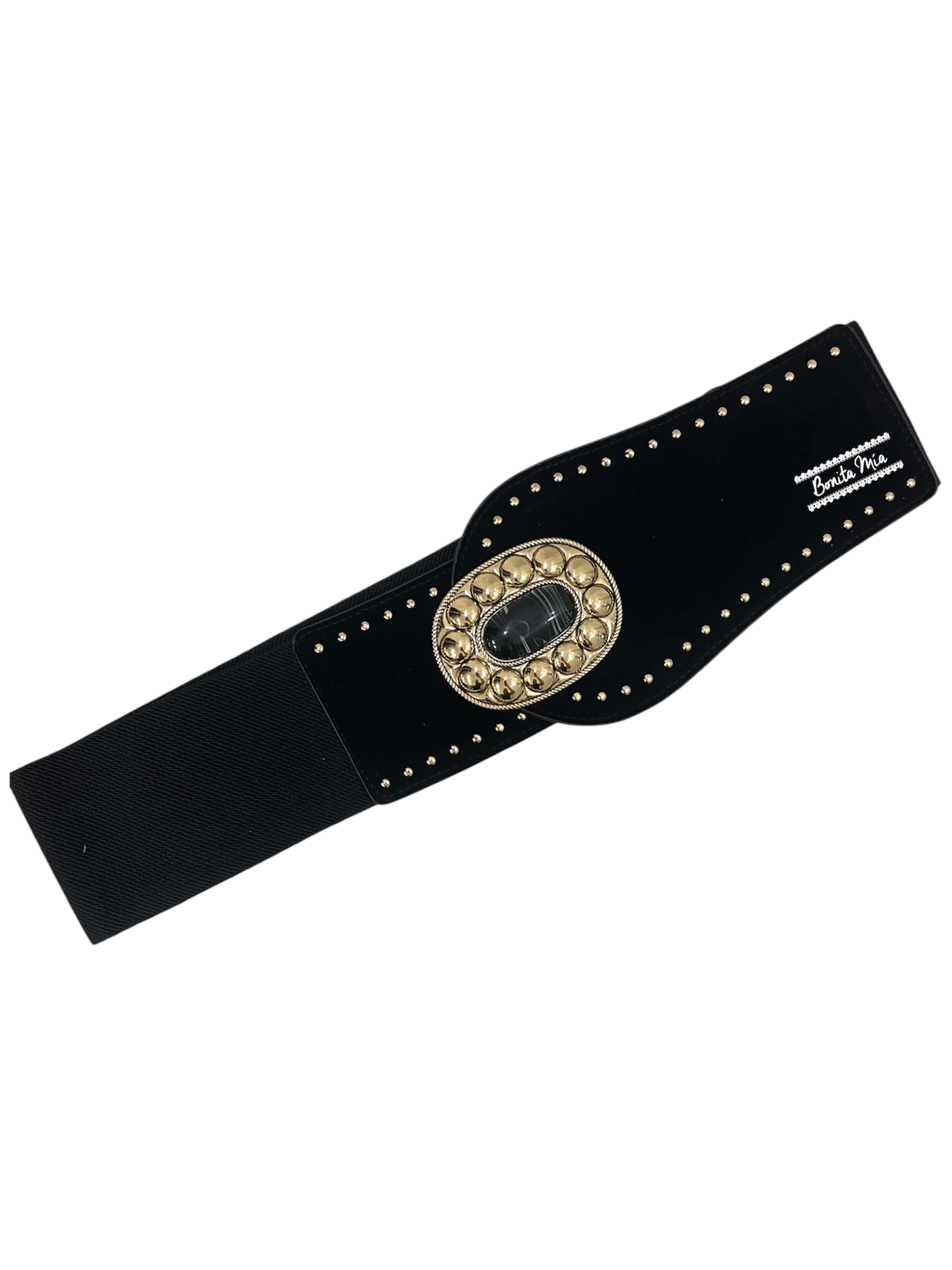 Cinturón elástico negro de ante con detalle de tachas y cierre en nácar y dorado.