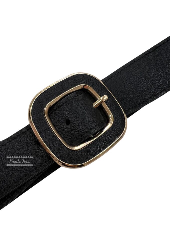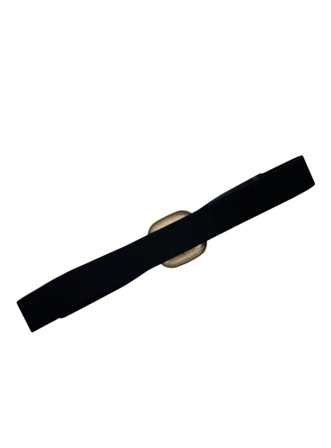 Cinturón elástico negro con hebilla cuadrada y detalles en dorado.
