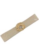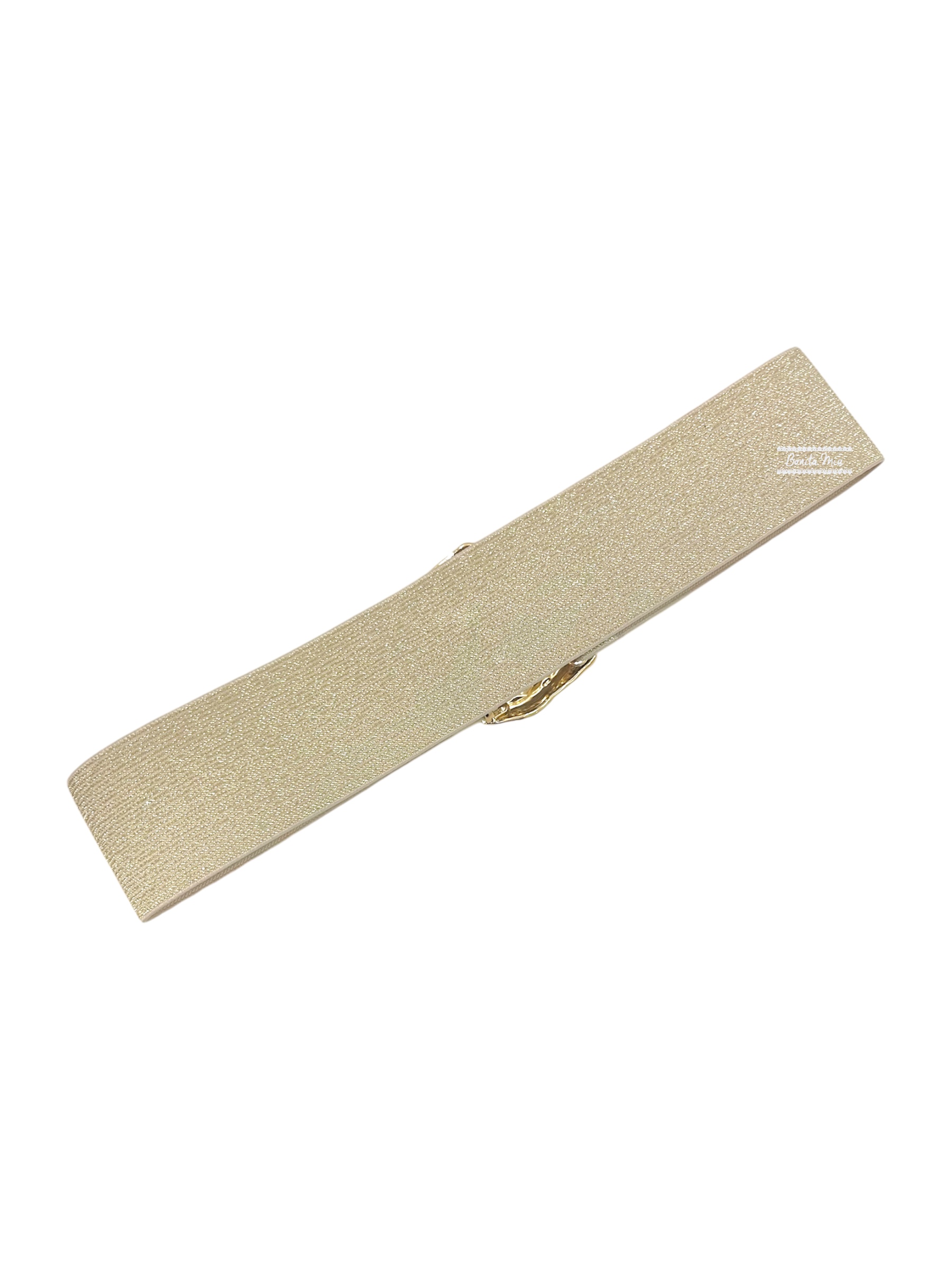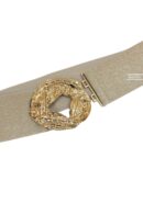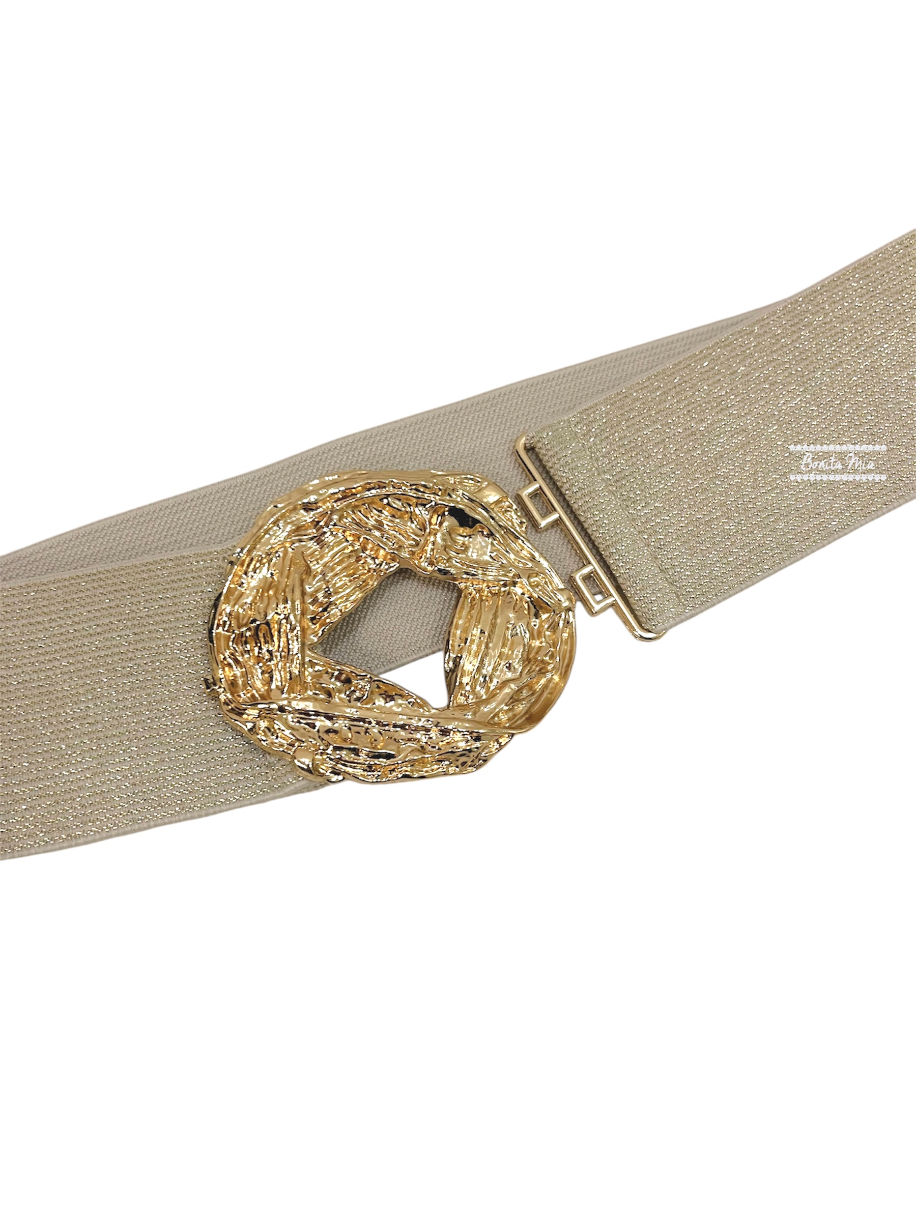 Cinturón elástico dorado con detalle de óvalo irregular de metal. Cierre de anilla.