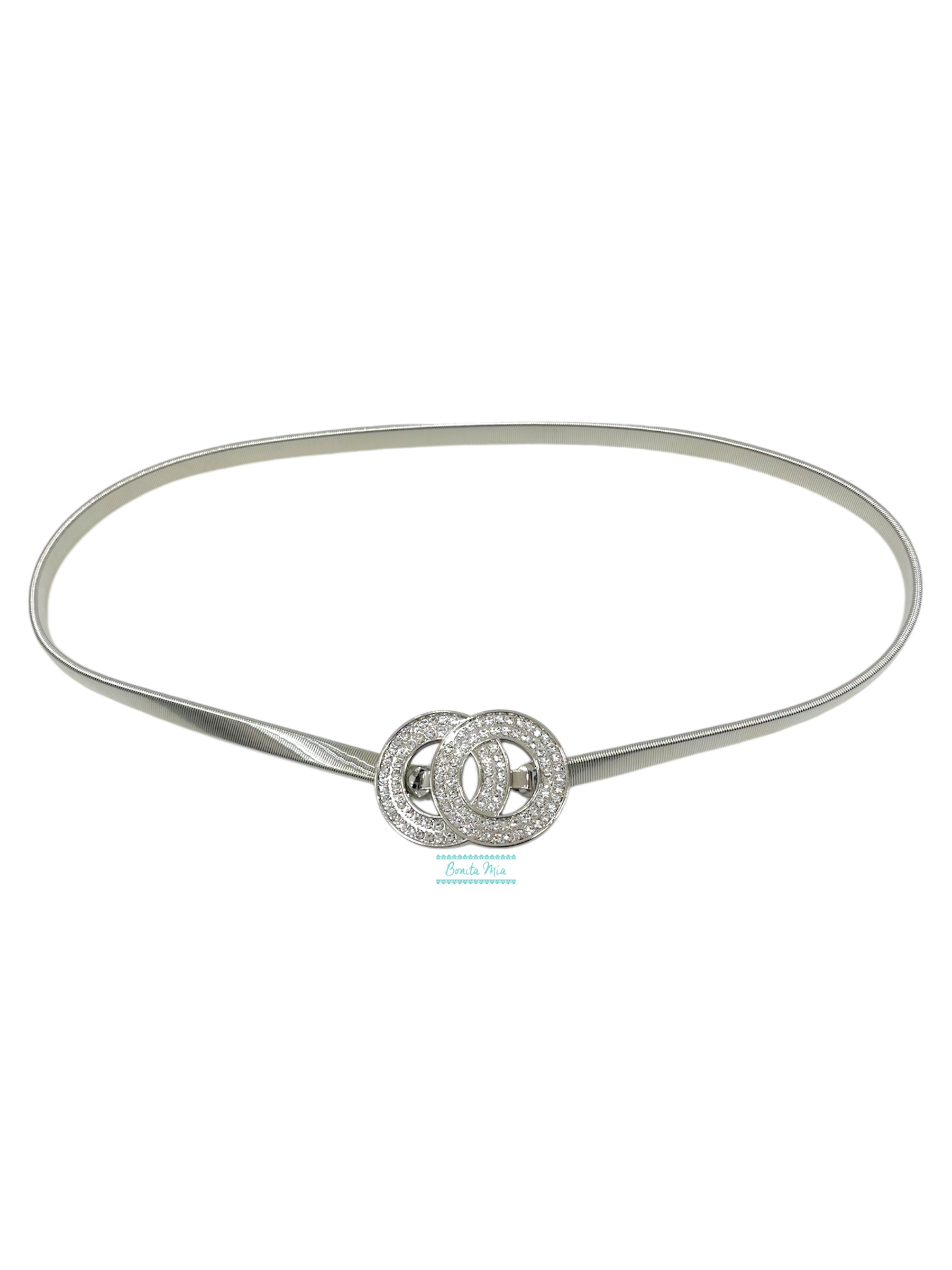 Cinturón elástico de metal plata con detalle de círculos de strass en el centro. Cierre por la parte delantera (enganche).