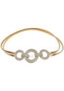 Cinturón elástico de metal dorado con detalle de círculos de strass en el centro. Cierre por la parte delantera (enganche).