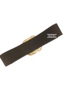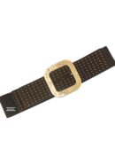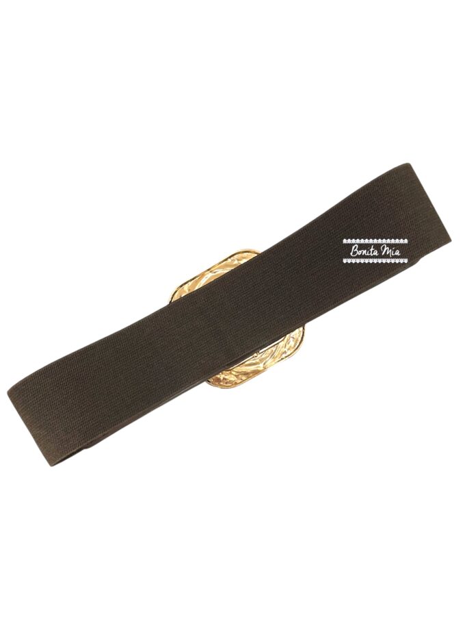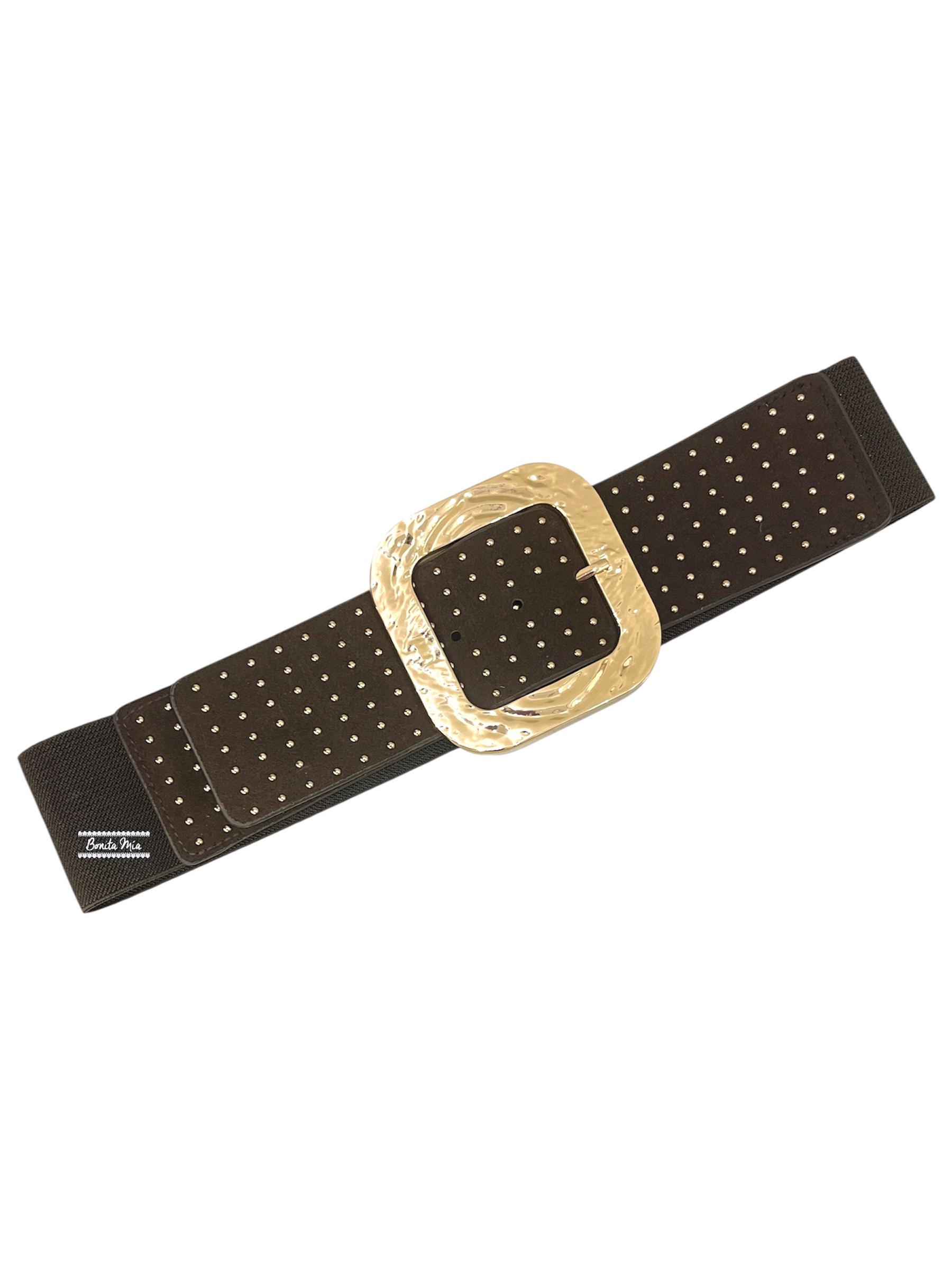 Cinturón elástico marrón chocolate de ante con tachas y cierre de hebilla dorado.