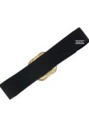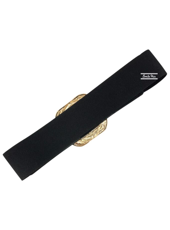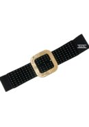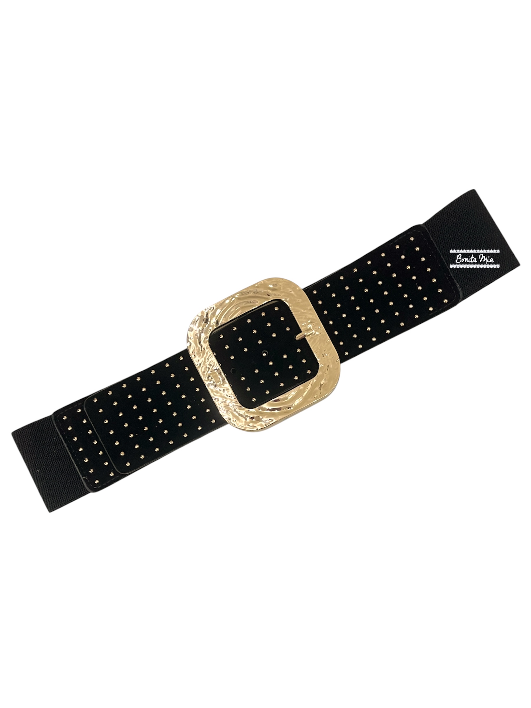 Cinturón elástico negro de ante con tachas y cierre de hebilla dorado.