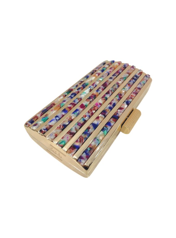 Clutch de metal dorado con rayas en nácar estampadas en tonos blanco, azul, buganvilla, naranja, aguamarina… Incluye cadena para colgar dorada. Cierre de tipo click.
