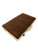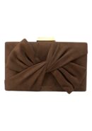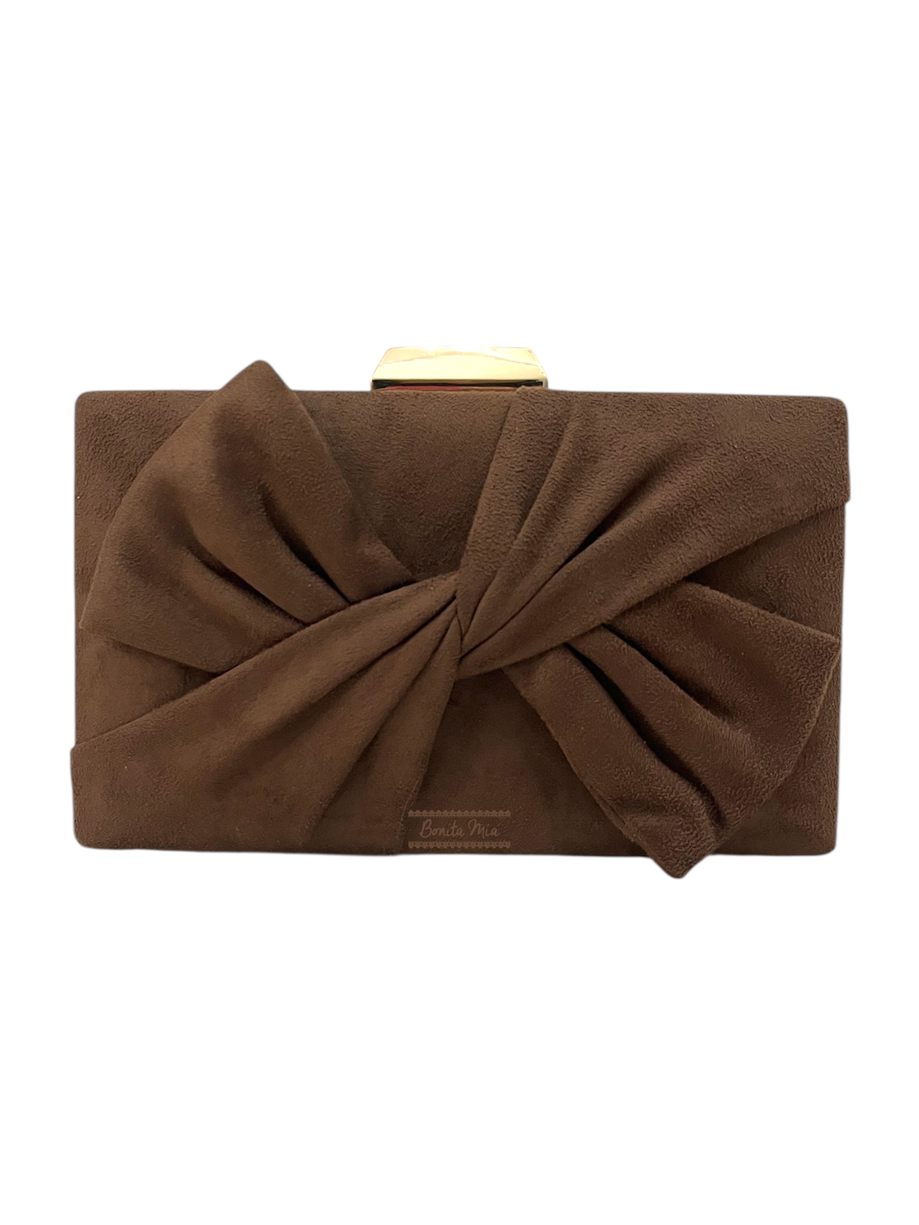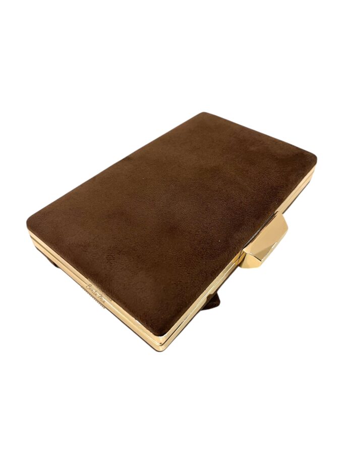 Clutch de antelina en color marrón chocolate con marco metálico en dorado y parte delantera con diseño de lazo. Cierre de click en forma rectangular. Incluye cadena para colgar en dorada.