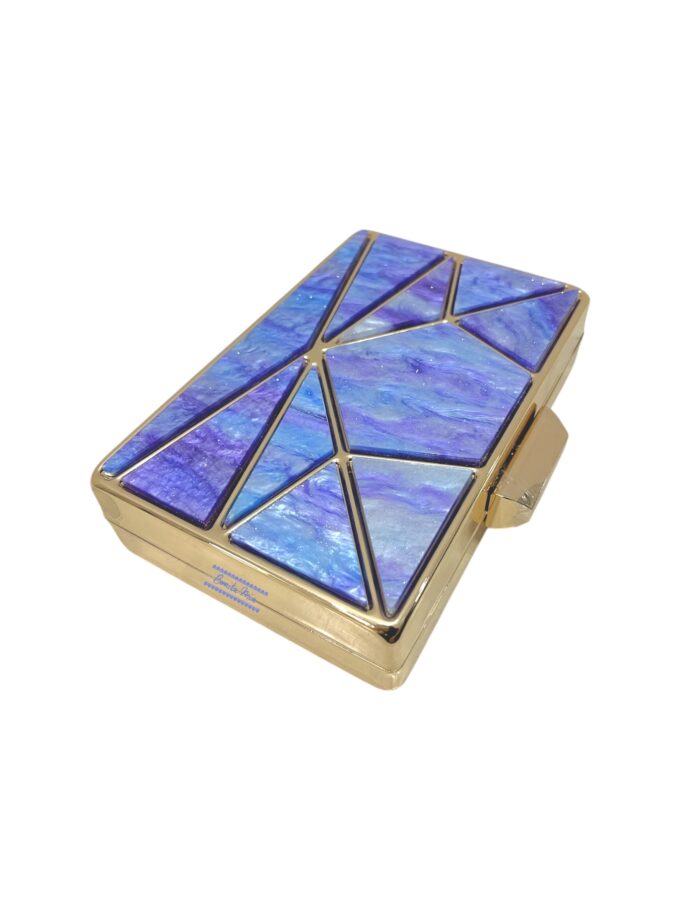 Clutch de nácar con marco metálico (dorado) en tonos turquesa y morado con brillo. *Incluye cadena para colgar en tono dorado. Cierre de click.
