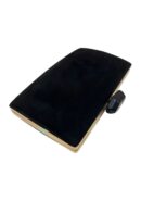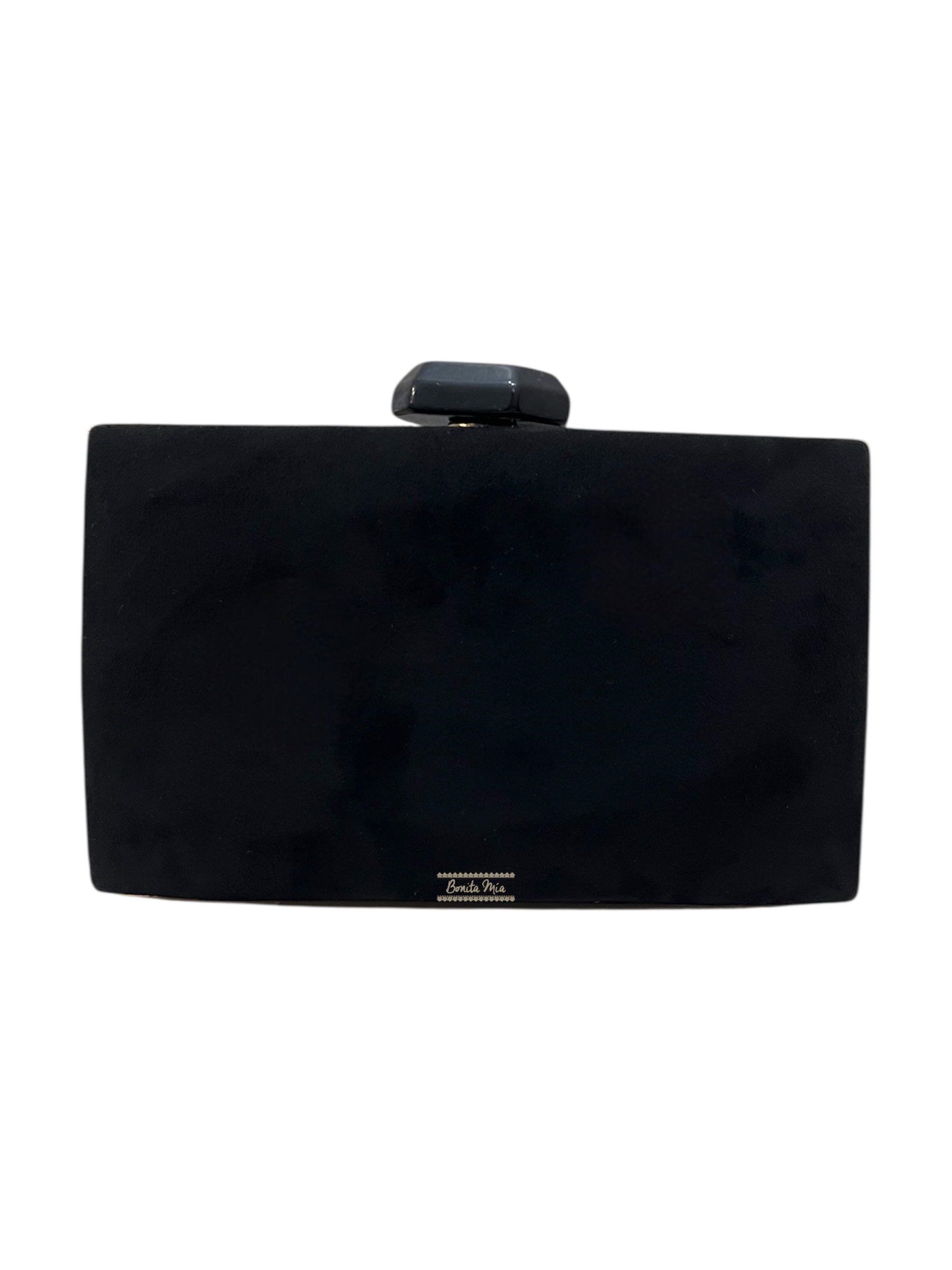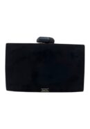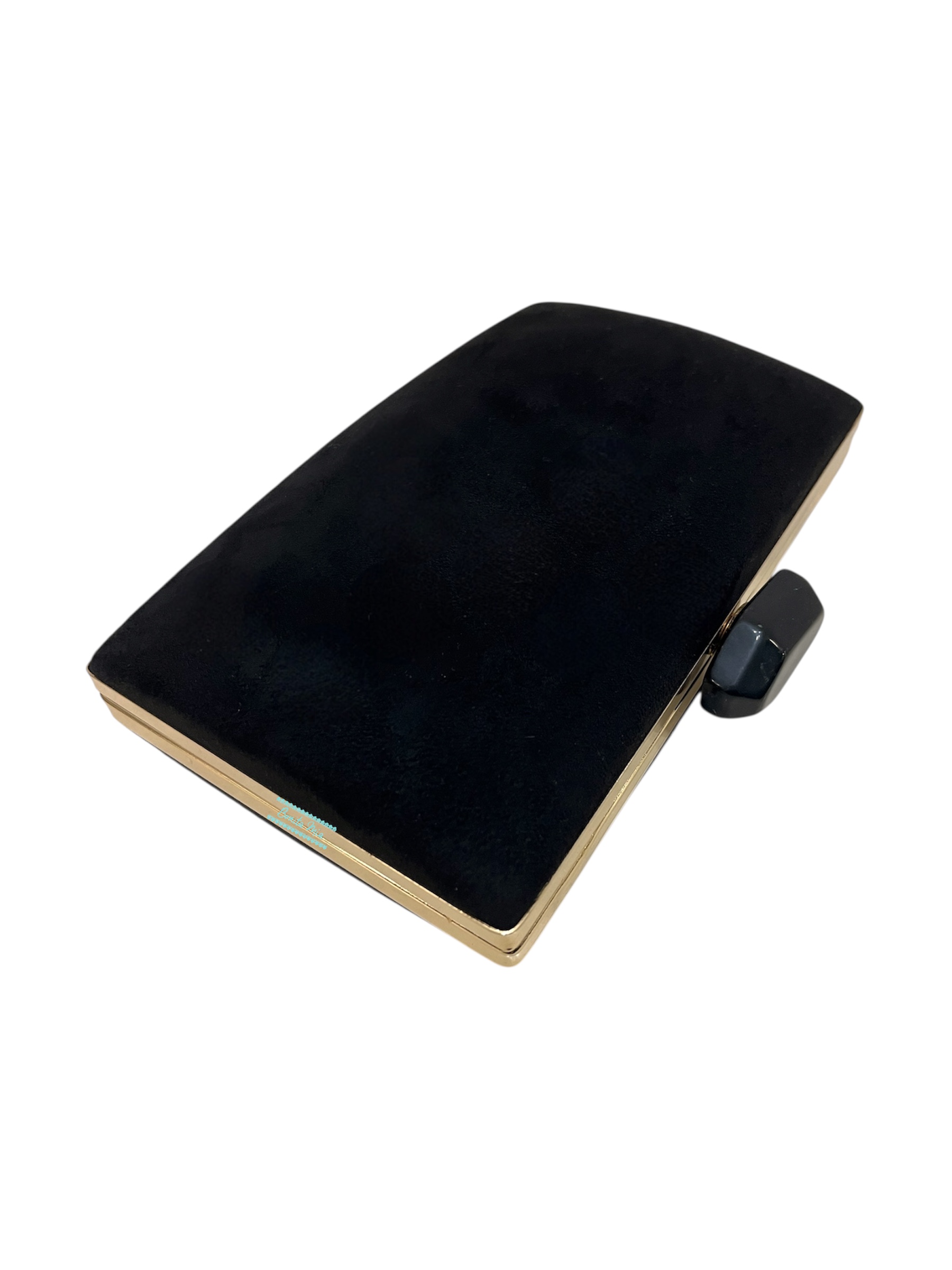 Clutch de antelina negro con detalle de cierre del mismo tono y bordes dorados. Tipo de cierre: click.