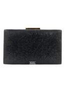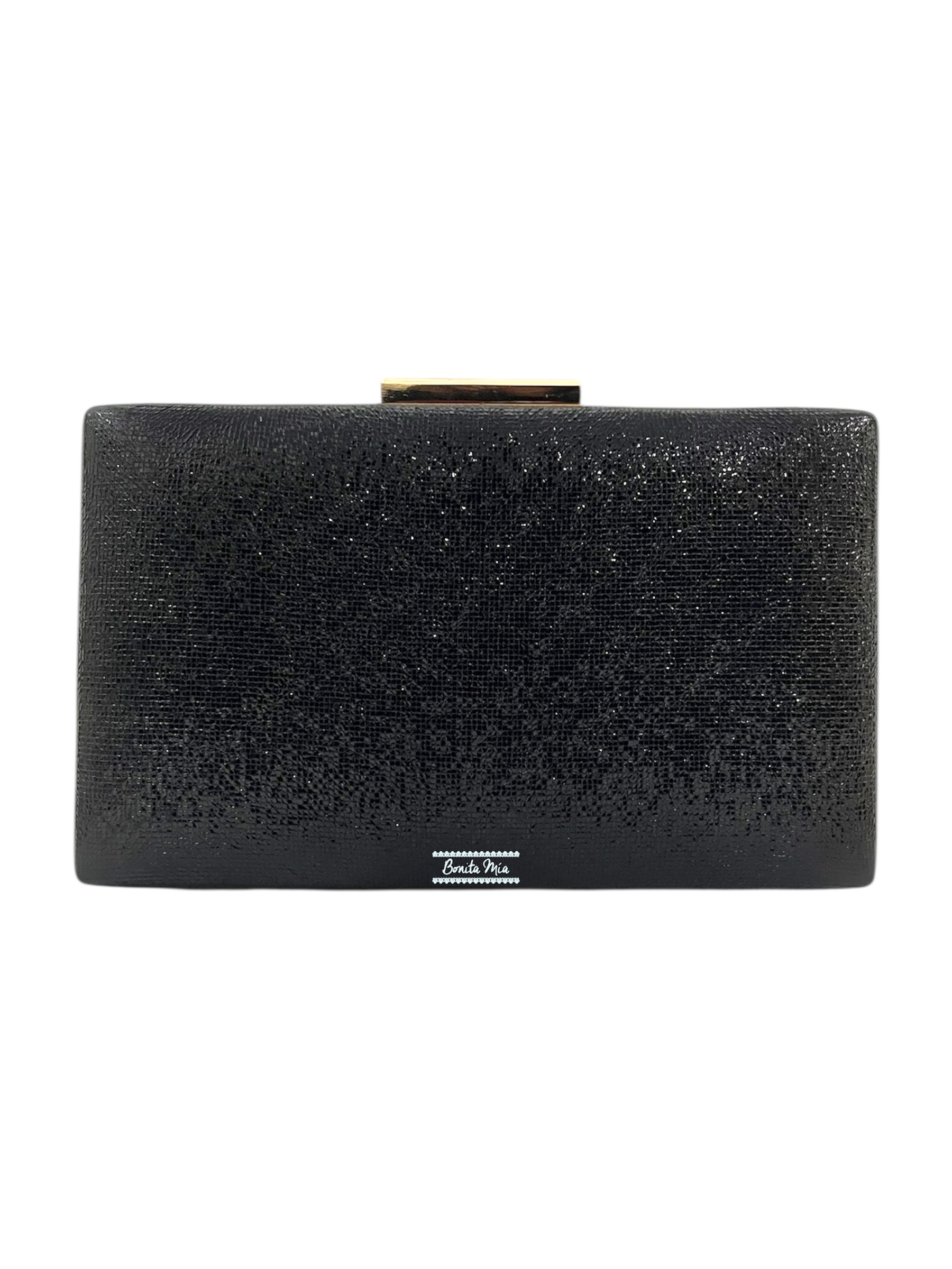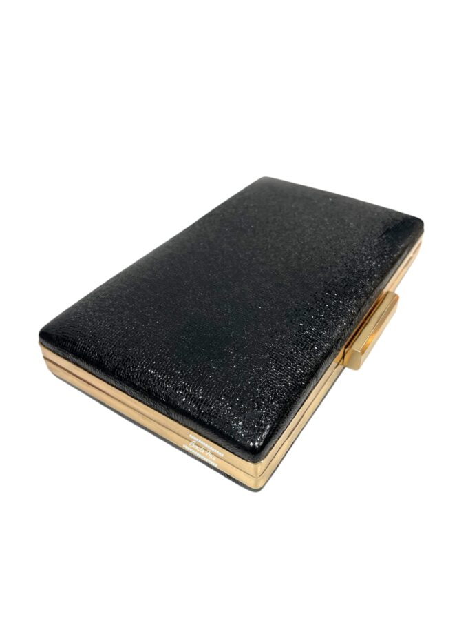 Clutch brillante negro con detalle de cierre rectangular. Incluye cadena para colgar dorada.