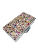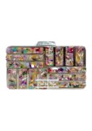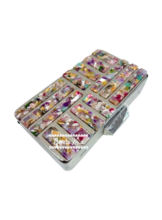 Clutch de nácar con marco metálico (plata) y nácar en varios tonos (amarillo, verde, lila, blanco, agua…). *Incluye cadena para colgar en plata. Cierre de click.