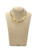 Colgante de acero inoxidable con abalorios en dorado con forma de moneda. Cierre en color dorado.