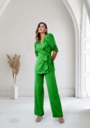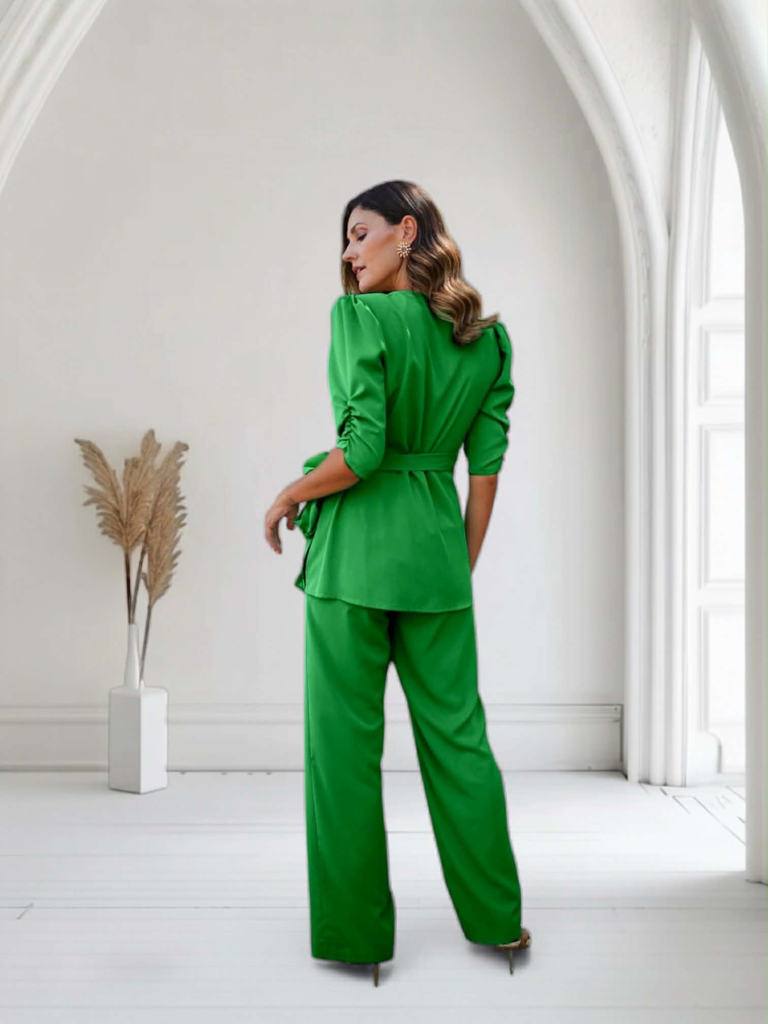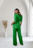 Conjunto verde en tejido crep fino fluido con caída, blusa cogida en lateral con lazada y mangas abullonadas, lleva hombreras. Pantalón de pierna ancha con cremallera lateral izquierda.