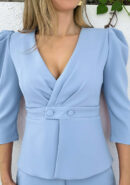 Conjunto celeste de top abotonado y pantalón de campana con botón, cremallera y goma atrás.