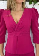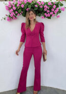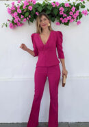 Conjunto fucsia de top abotonado y pantalón de campana con botón, cremallera y goma atrás.
