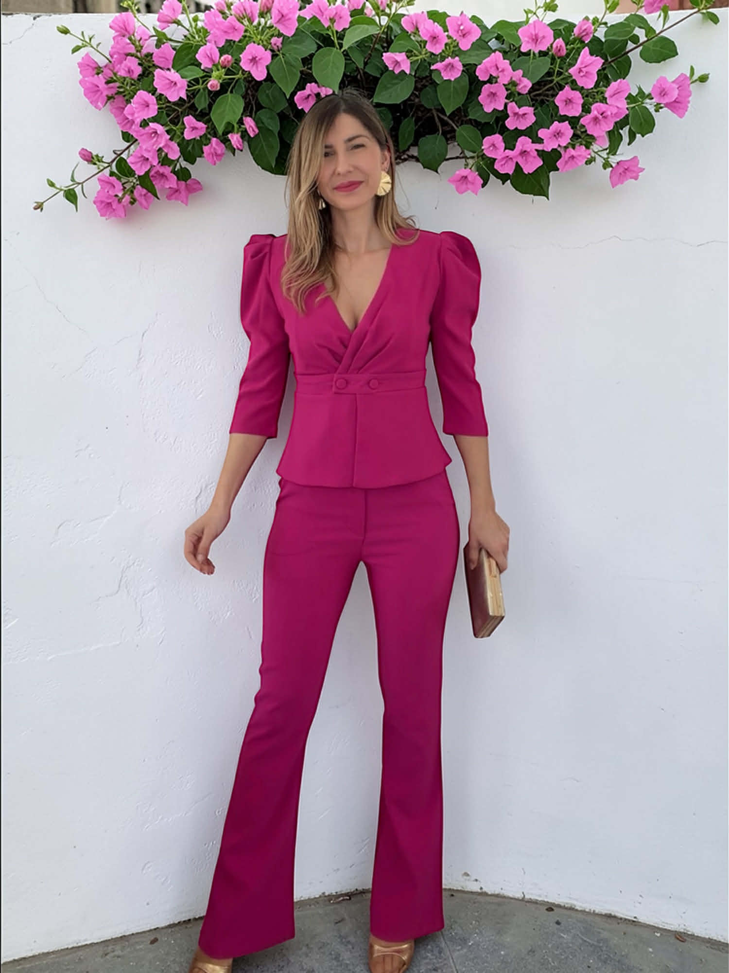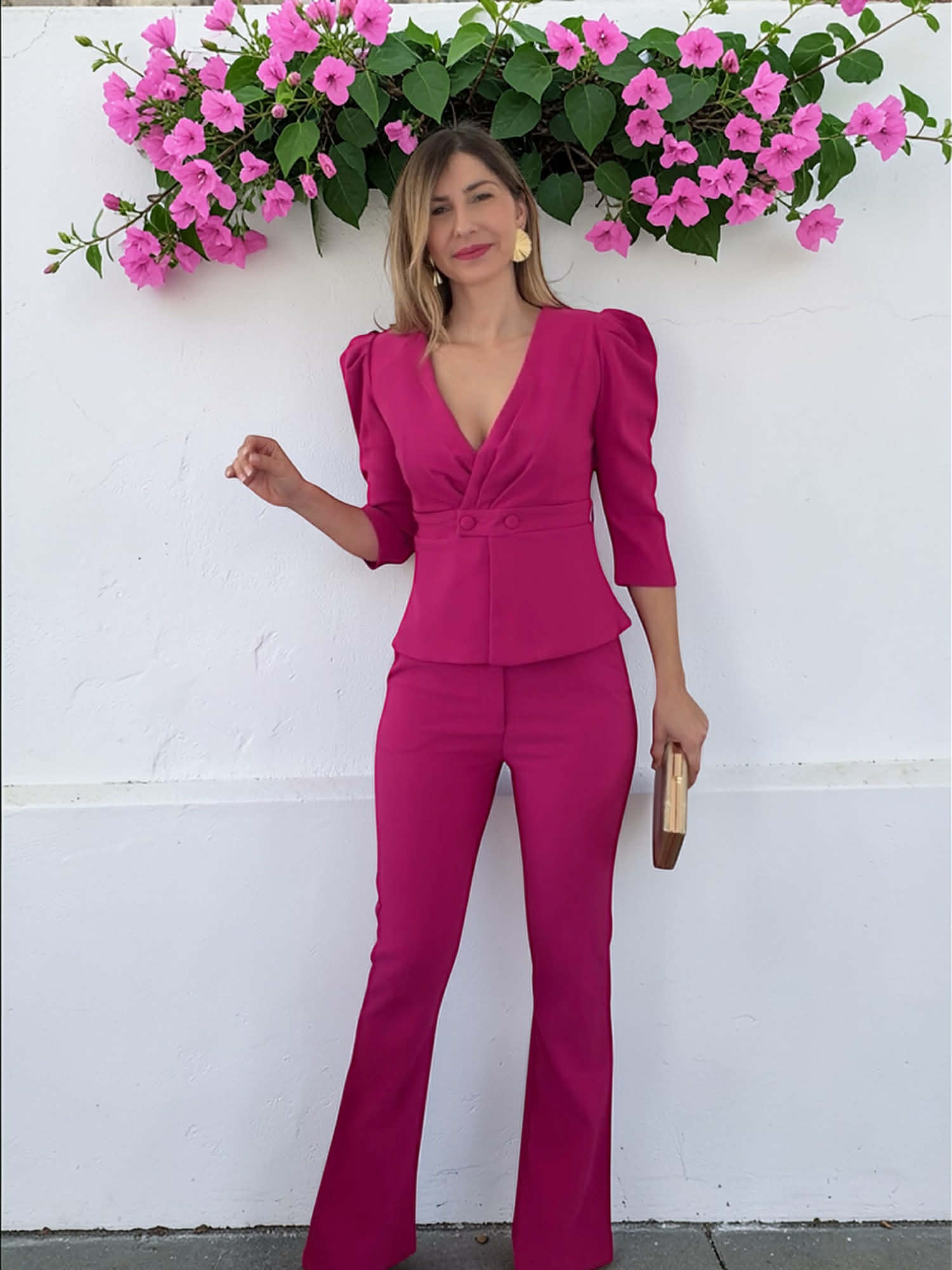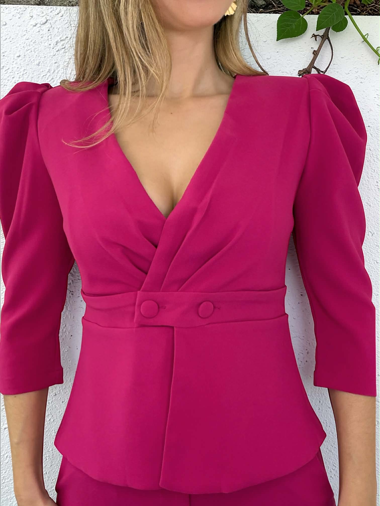 Conjunto fucsia de top abotonado y pantalón de campana con botón, cremallera y goma atrás.