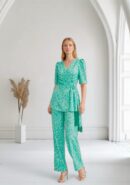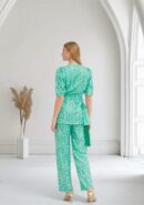 Conjunto de blusa y pantalón satinado estampado en tonos verde agua. Blusa con lazada y detalle de flecos. Pantalón de pata ancha con botón delantero y cremallera.