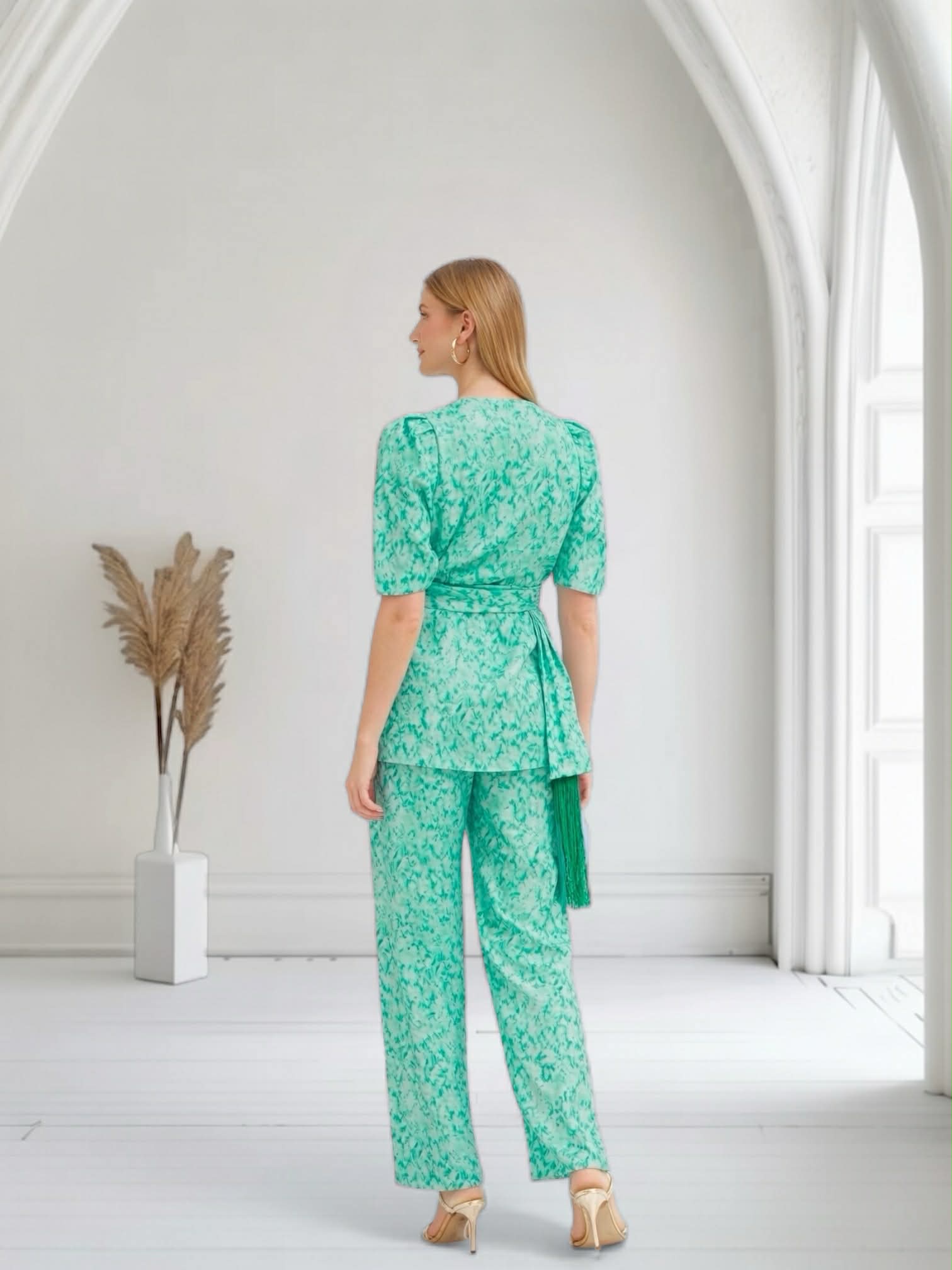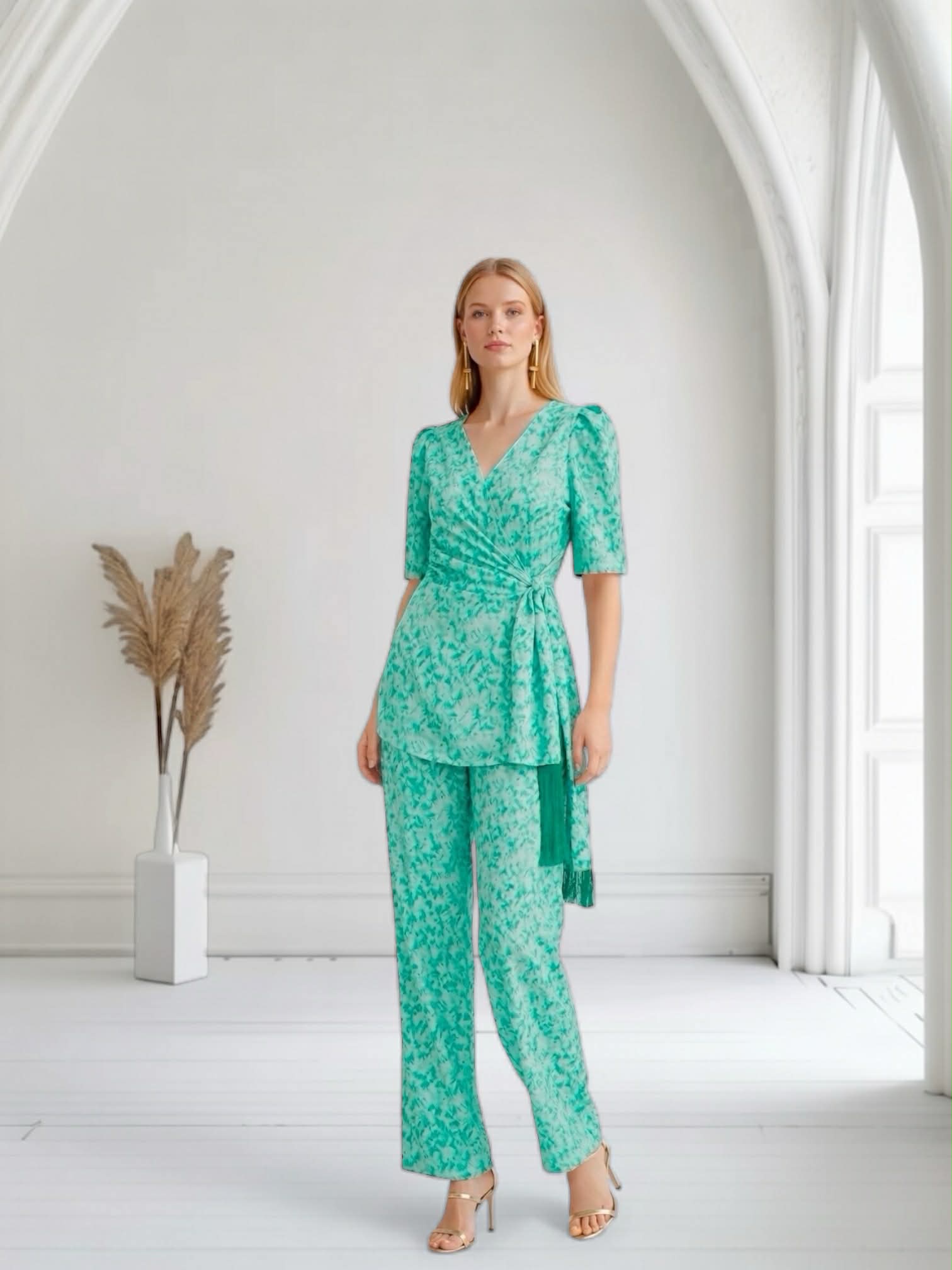 Conjunto de blusa y pantalón satinado estampado en tonos verde agua. Blusa con lazada y detalle de flecos. Pantalón de pata ancha con botón delantero y cremallera.