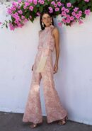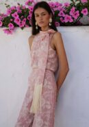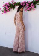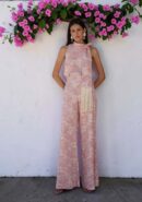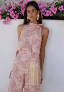 Conjunto rosa palo bordado de top con lazada y fleco. Pantalón recto con cremallera invisible lateral.