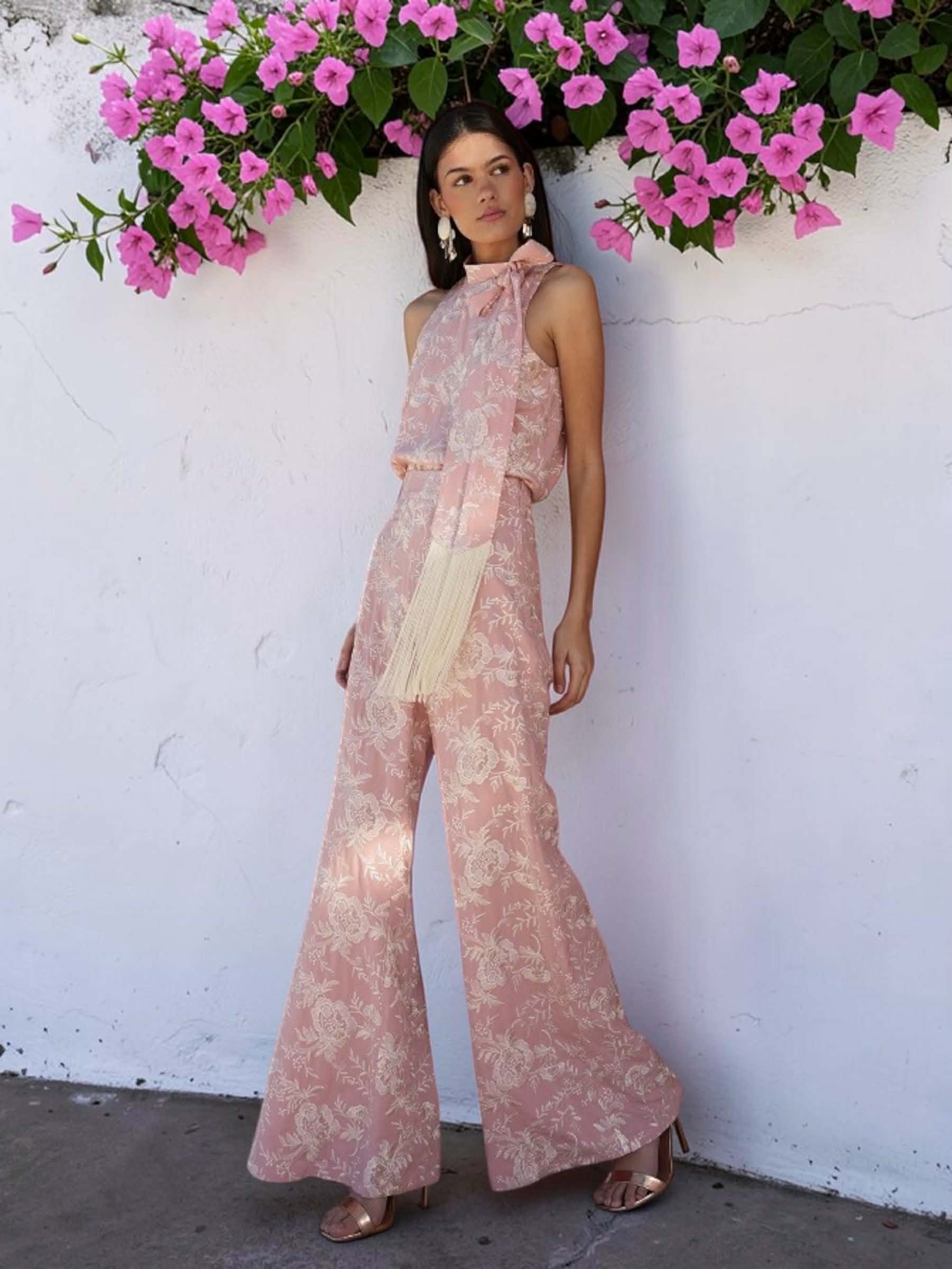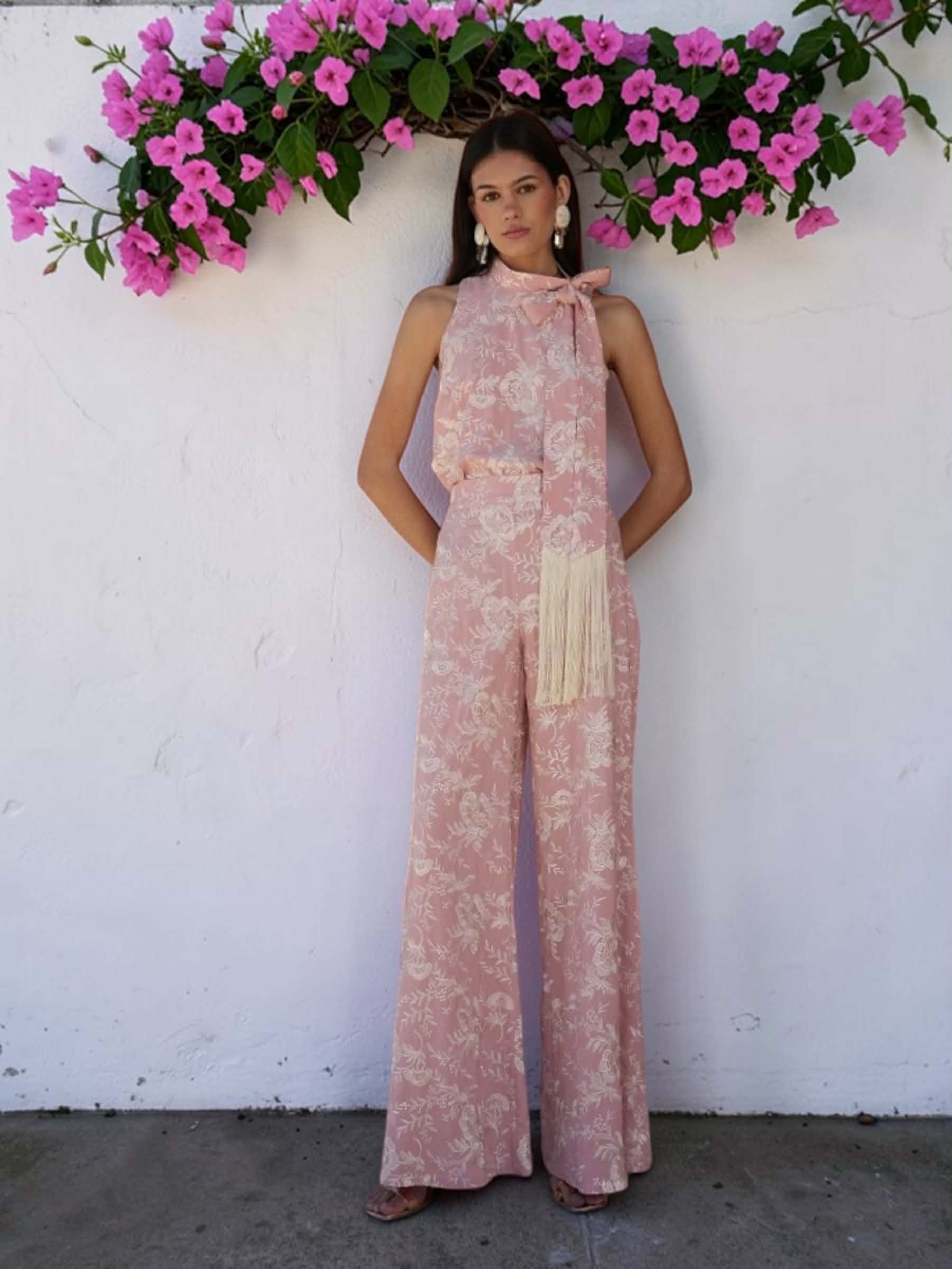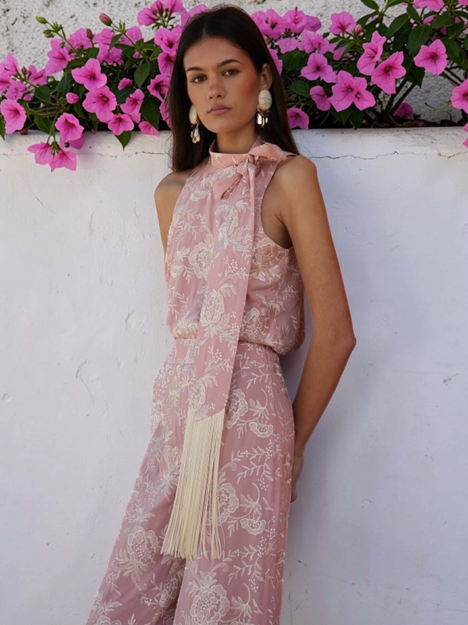 Conjunto rosa palo bordado de top con lazada y fleco. Pantalón recto con cremallera invisible lateral.