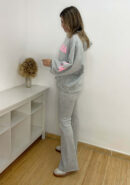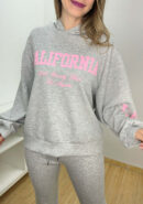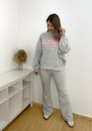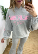 Chándal gris en tendencia de moda con sudadera oversize y pantalón flare (campana) Sudadera con gorro y puños y lleva las letras pintadas en rosa “California” y manga izquierda “L.A.” Pantalón con lazada ajustable.