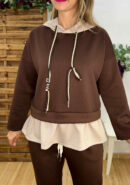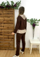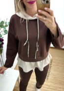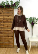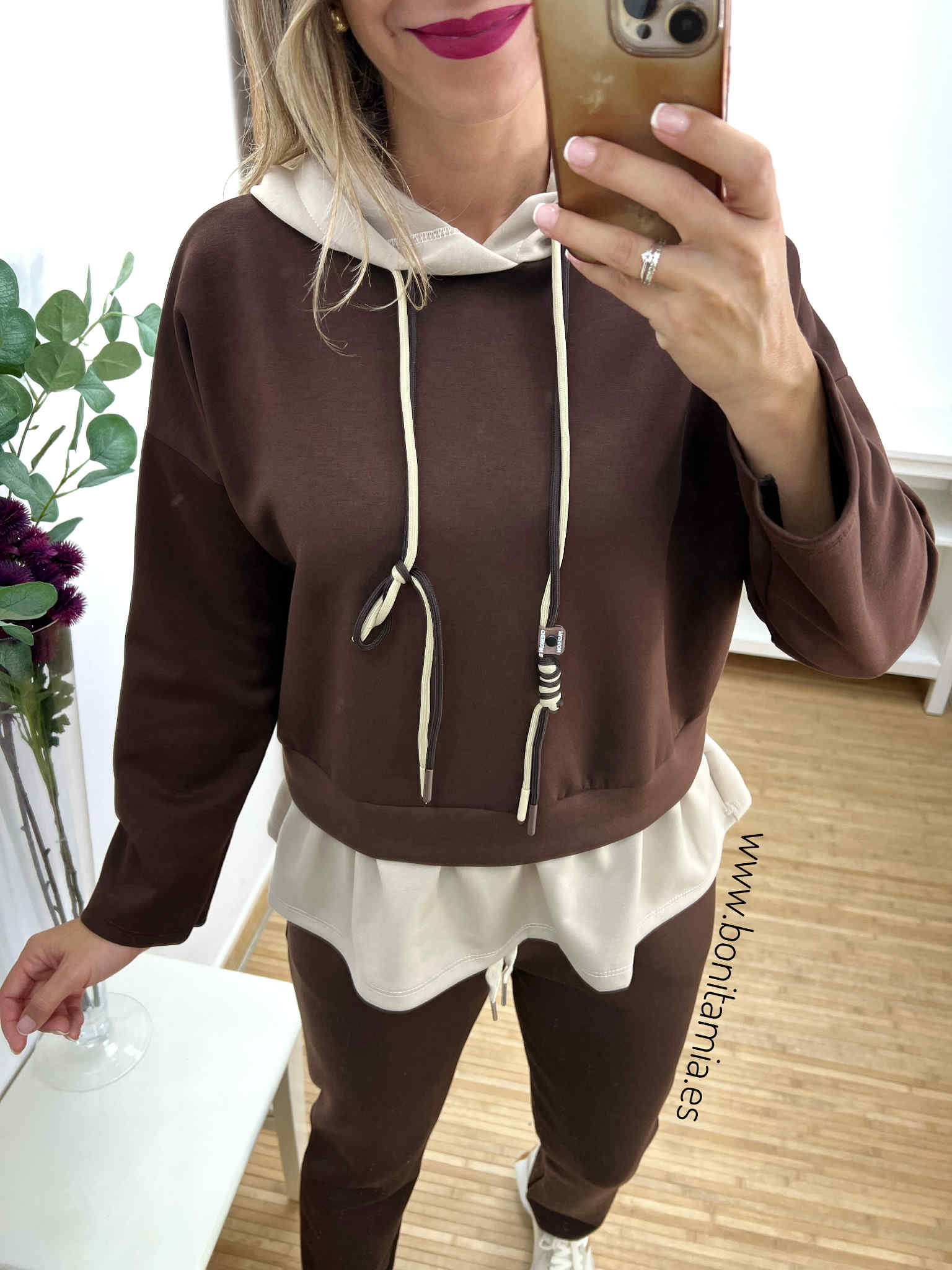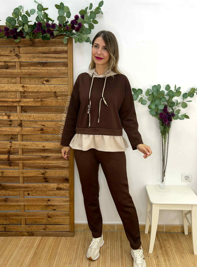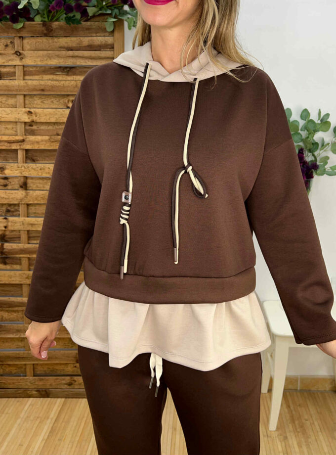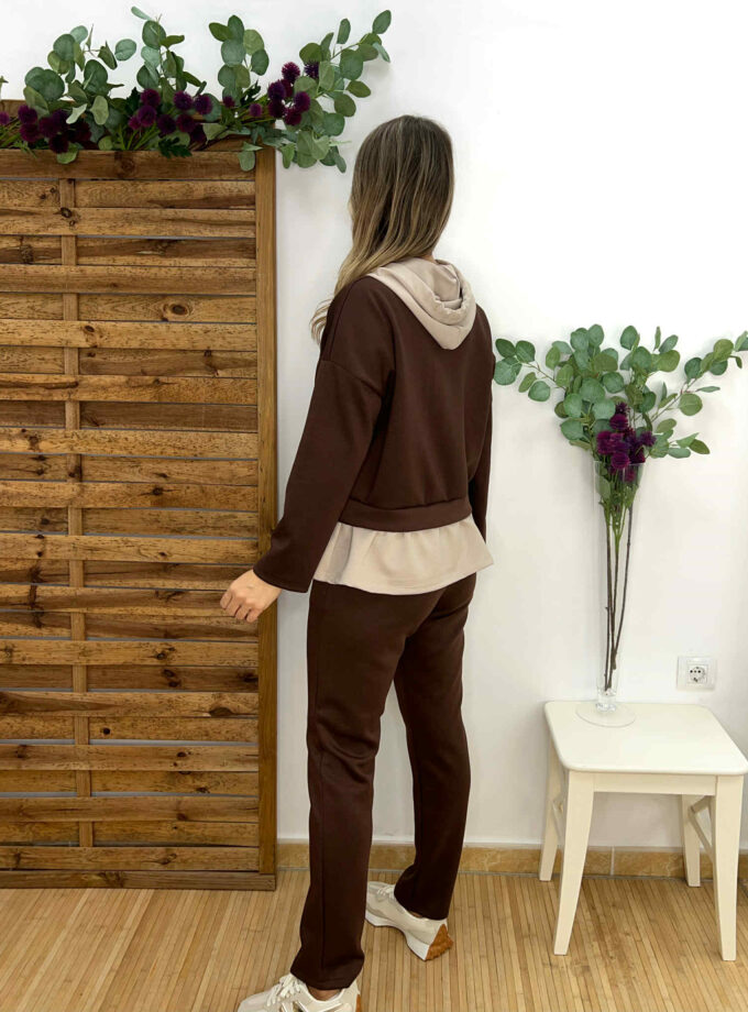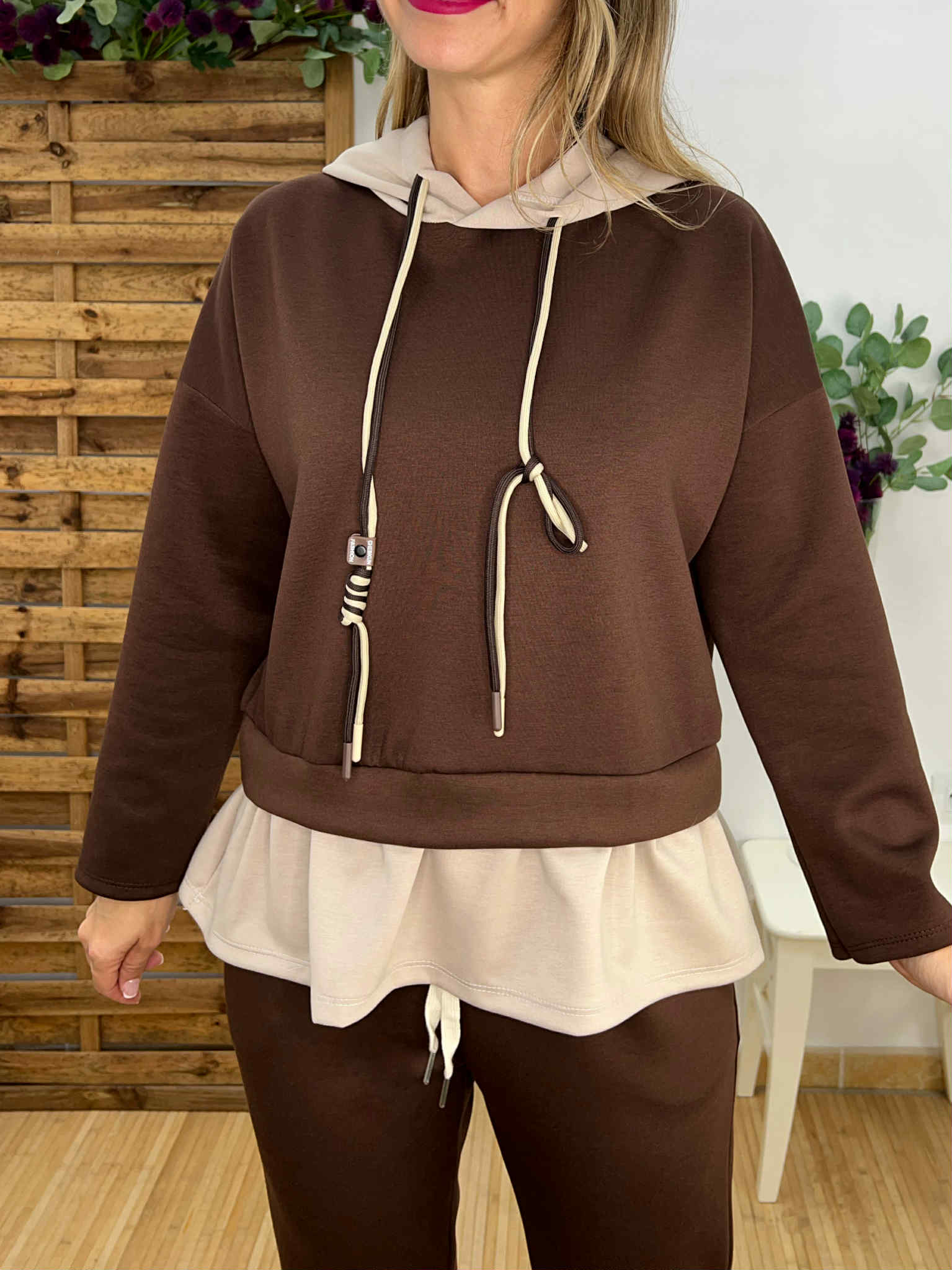 Conjunto marrón chocolate y taupe de sudadera oversize con bajo y capucha. Pantalón con goma en la cintura, lazada para ajustar y bolsillos laterales.