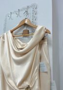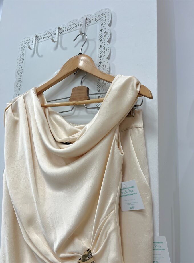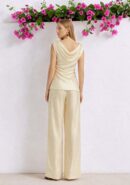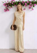 Conjunto satinado amarillo mantequilla de top con fruncido y adorno dorado. Pantalón recto con goma en la cintura, botón y bolsillos laterales.