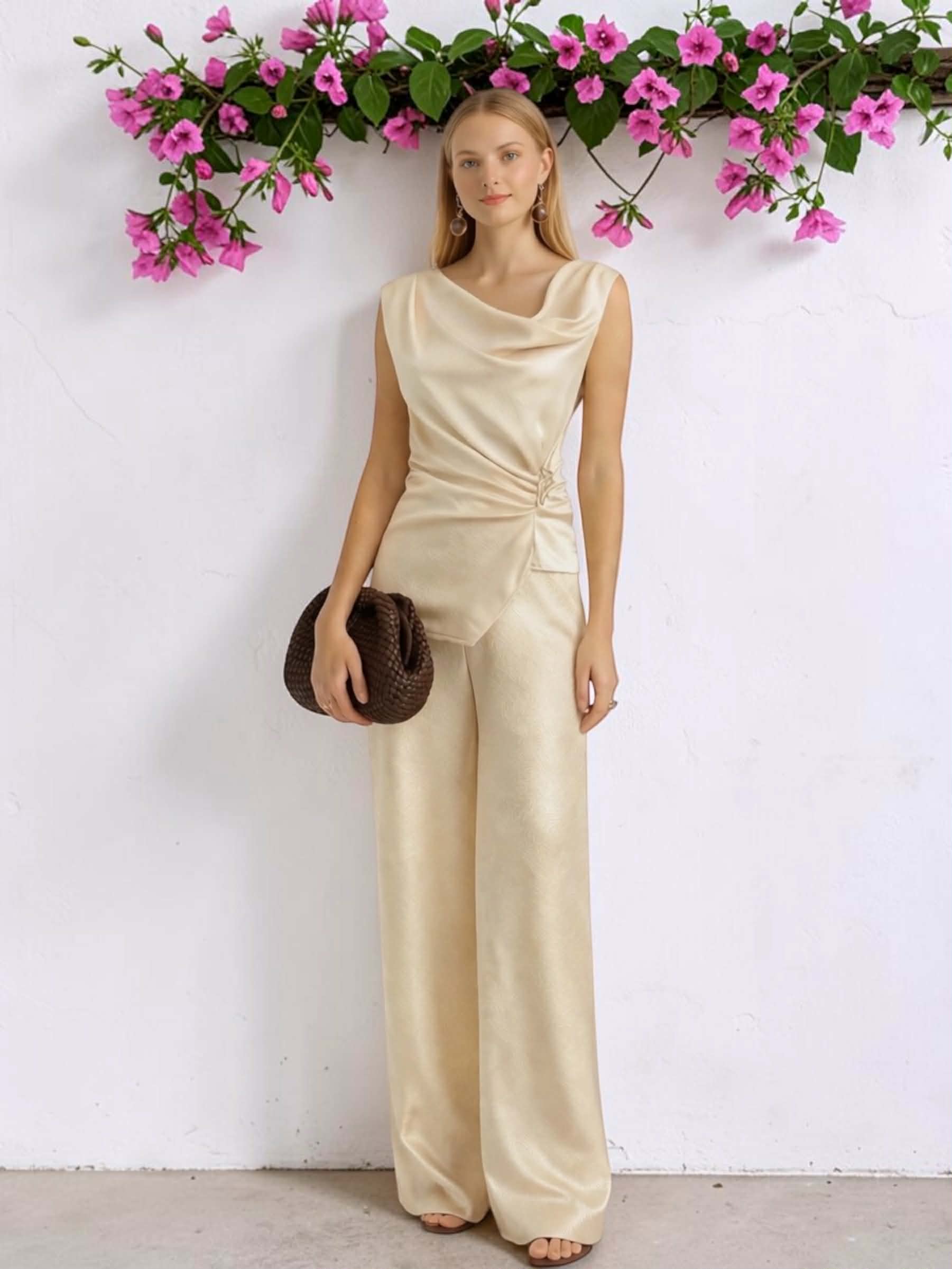 Conjunto satinado amarillo mantequilla de top con fruncido y adorno dorado. Pantalón recto con goma en la cintura, botón y bolsillos laterales.